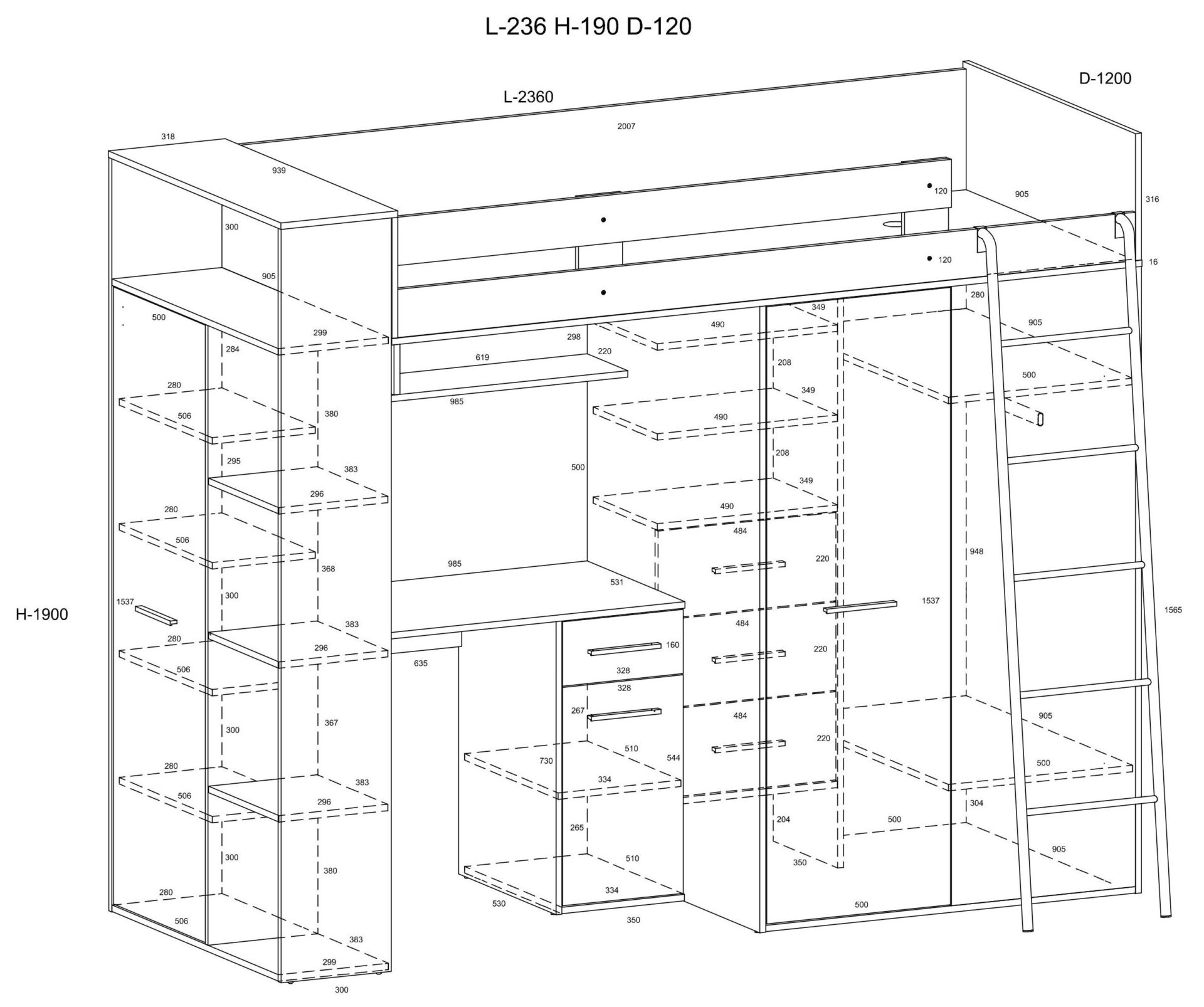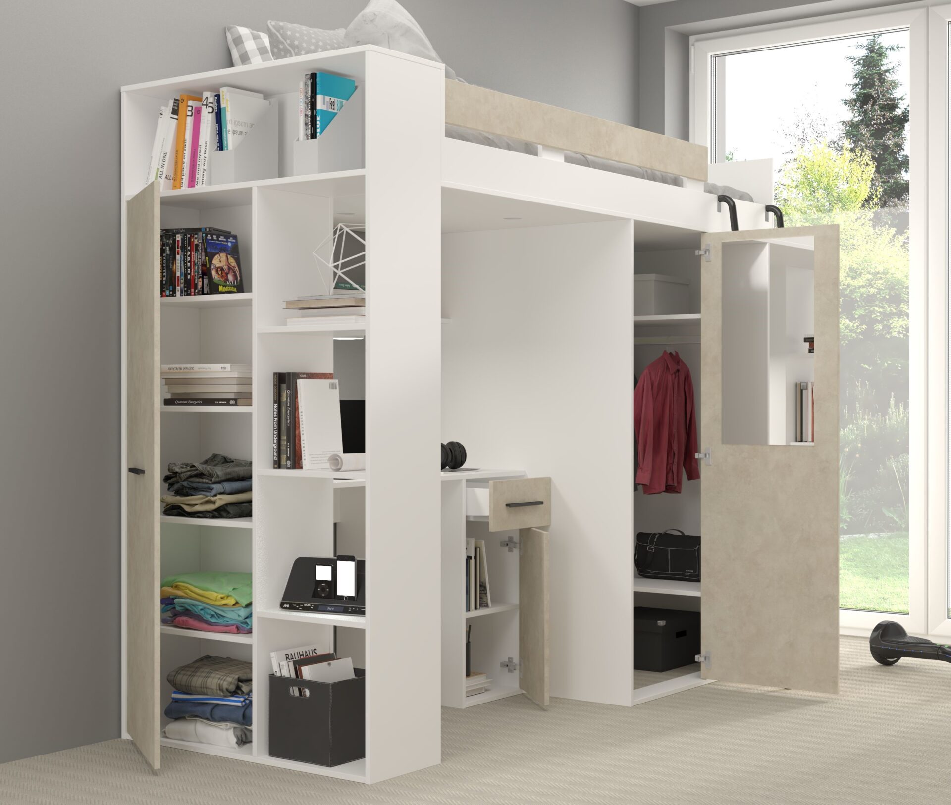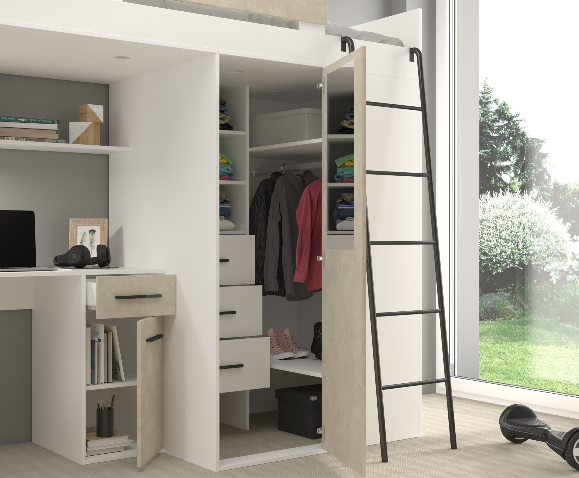 RAVENA P antresolė be čiužinio. 16 mm plokštė, ABS kraštas, švelnaus uždarymo sistema stalčiuose ir spintelėse. Spalva: balta / granados migdolų spalvos.