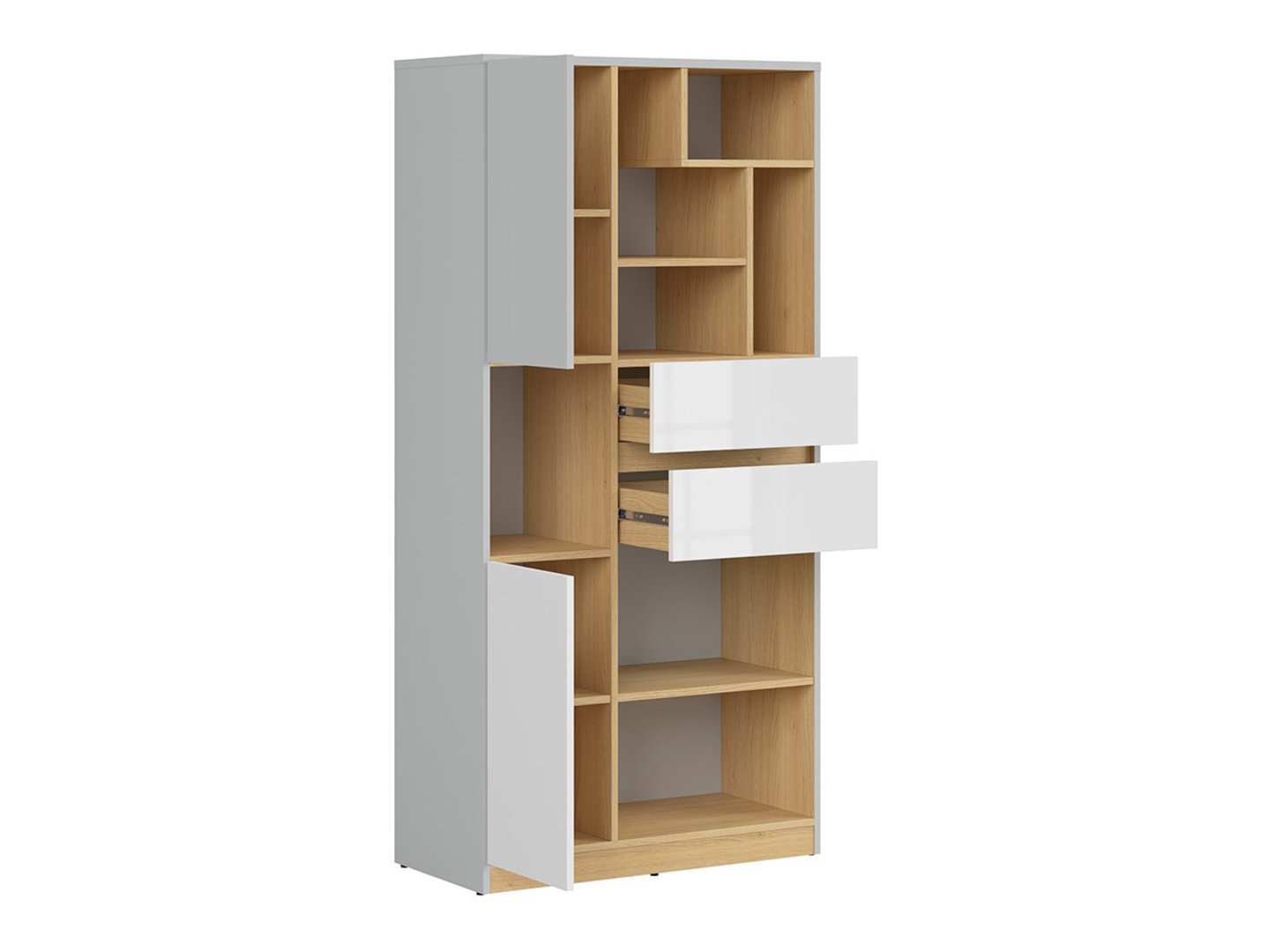 NANDU dvidurė knygų lentyna su dviem stalčiais 79.5 cm šviesiai pilka/poliruoto ąžuolo/blizgios baltos spalvos