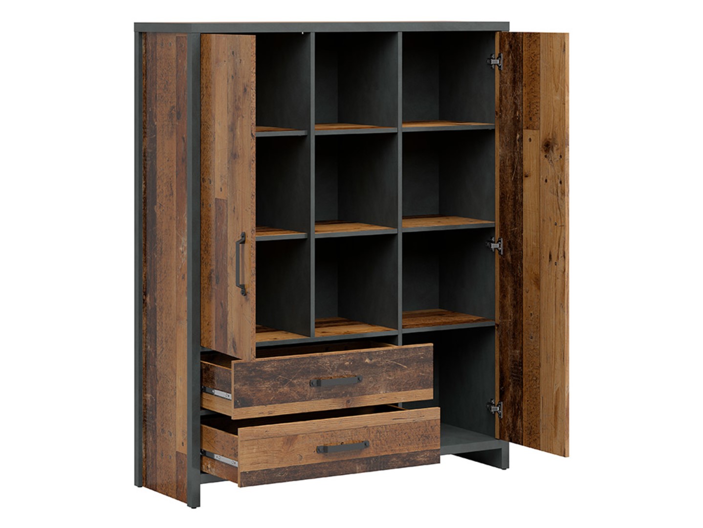 WESTON dvidurė knygų lentyna su dviem stalčiais, 120 cm, senovinio stiliaus, tamsi pušis/čiužinys