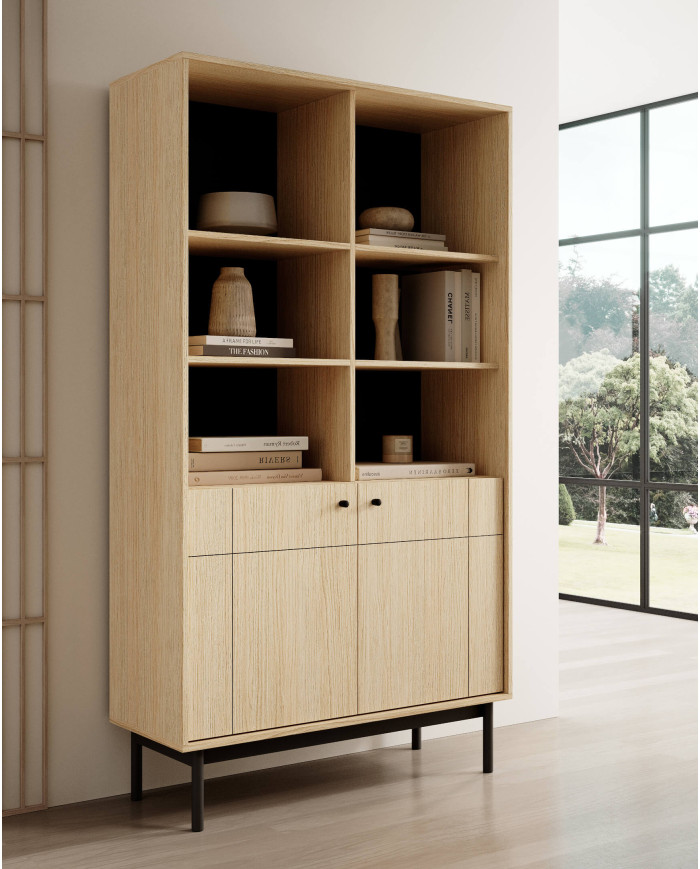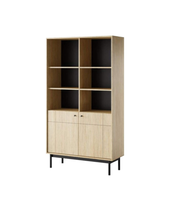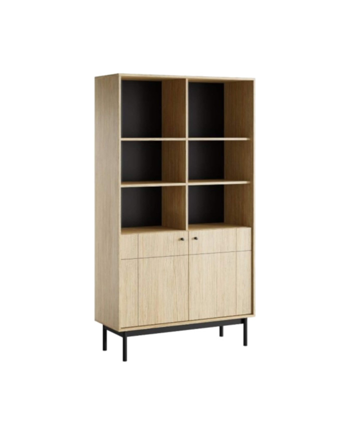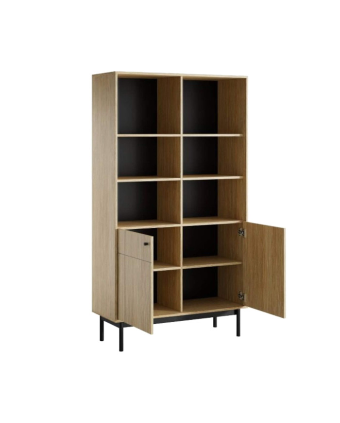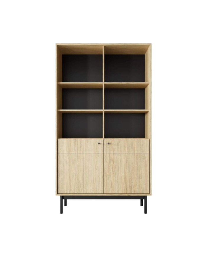 Japandi R104 knygų lentyna, durelėmis, lentynų nišomis, Linea ąžuolo/juodos spalvos
