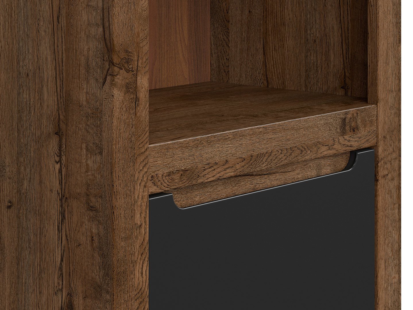 „Ruso“ knygų lentyna – tobula knygų lentyna. Jei jūsų butas dekoruotas klasikiniu stiliumi ir ieškote tobulos vietos savo knygų lentynai, „Ruso“ knygų lentyna gali pateisinti jūsų lūkesčius ir dar daugiau. Štai kodėl turėtumėte apsvarstyti šią knygų lentyną: „Ruso“ knygų lentynoje yra atviros lentynos, puikiai tinkančios mėgstamoms knygoms eksponuoti. Apatinė spintelė suteikia papildomos vietos vertingiems daiktams ar kitiems daiktams laikyti. Tamsaus balandžio ąžuolo korpuso ir matinės juodos spalvos fasadų derinys suteikia „Ruso“ knygų lentynai elegantišką ir modernų vaizdą, sukurdamas kontrastą klasikiniame interjere. Dekoratyviniai cokoliai ir unikalios rankenos, kurios priekyje yra įdubimų formos, suteikia „Ruso“ knygų lentynai unikalią išvaizdą ir modernų charakterį. Knygų lentyna komplektuojama su matinės spalvos juostele, kurią galima pritvirtinti priekyje esančiose įdubose. Ši detalė suteikia baldui unikalų charakterį. Dėl švelniai užsidarančių vyrių ir reguliuojamos stabdymo jėgos lentyna naudotis kasdien yra tylu ir patogu. „Ruso“ lentyna puikiai dera su kitais „Ruso“ kolekcijos elementais. Galite derinti ją su aukšta kolona ar kitais šios kolekcijos baldais, kad sukurtumėte visapusišką ir funkcionalią erdvę savo bute. Trumpai tariant, „Ruso“ lentyna yra baldas, kuris ne tik talpina jūsų knygų lentyną, bet ir suteikia jūsų interjerui elegancijos bei charakterio. Kruopšti apdaila, originalios detalės ir galimybė derinti ją su kitais „Ruso“ kolekcijos elementais paverčia ją patraukliu jūsų interjero dizaino elementu. Su „Ruso“ kolekcija galite sukurti darnią ir patogią erdvę, kuri atitiktų visus jūsų poreikius ir atspindėtų jūsų asmeninį stilių.