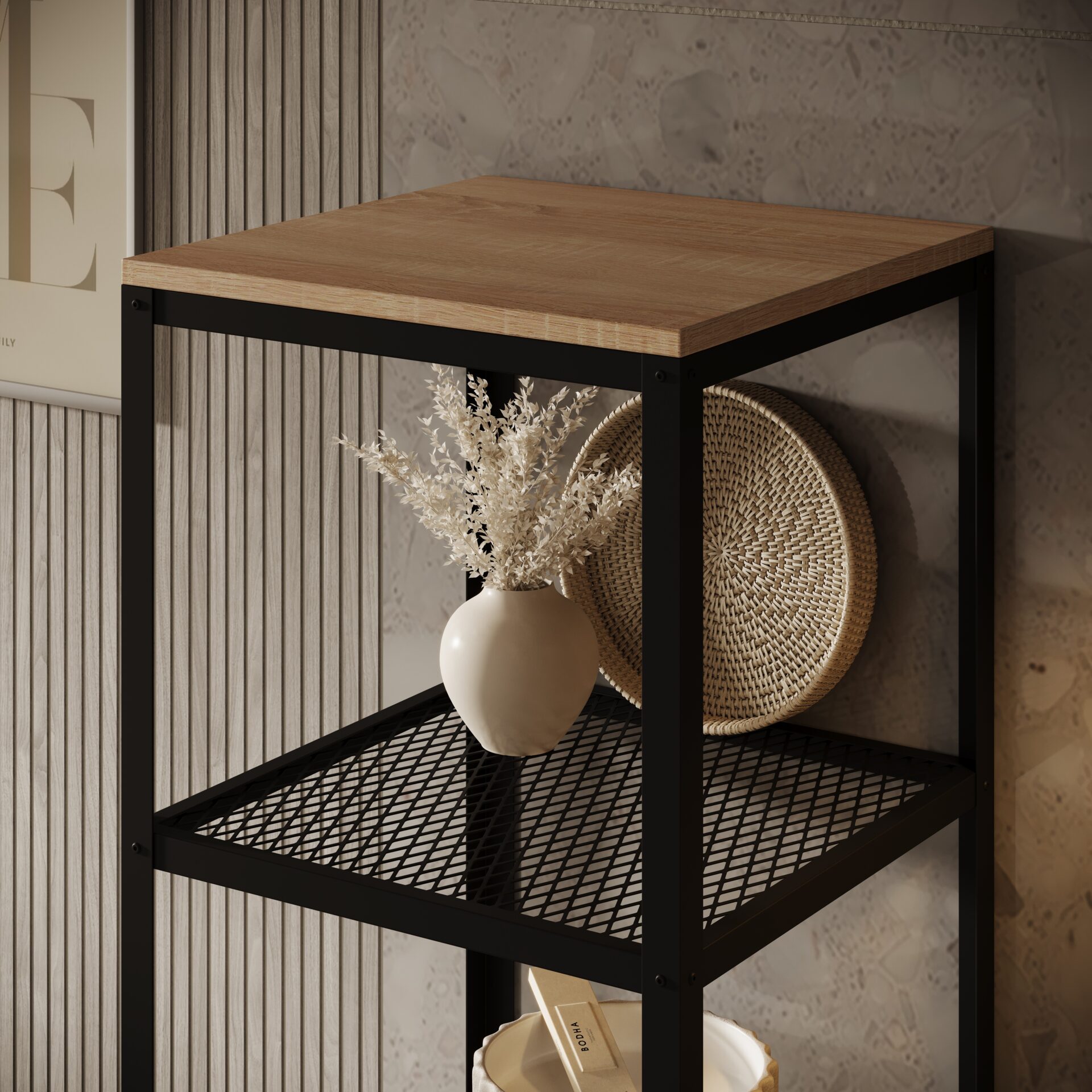 „Reli“ knygų lentyna – tai tobulas modernaus dizaino ir praktiškumo derinys. Knygų lentynos konstrukcija pagaminta iš tvirto metalo, užtikrinančio stabilumą ir ilgaamžiškumą, kartu suteikiančio jai industrinį charakterį. Metalinės dalys yra dažytos milteliniu būdu, todėl padidėja atsparumas įbrėžimams ir korozijai. Papildomas privalumas – lentynos, pagamintos iš laminuotos plokštės su natūralia apdaila, kurios interjerui suteikia šilumos ir jaukumo. Lentynų paviršiai lengvai valomi, atsparūs drėgmei ir mechaniniams pažeidimams, todėl tai praktiškas pasirinkimas ilgus metus. „Reli“ knygų lentyna puikiai tinka svetainėms, miegamiesiems, biurams ir namų bibliotekoms. Tai universalus baldas, kuriame galima laikyti knygas, dekoracijas ir augalus, sukuriant estetiškai patrauklią ir organizuotą erdvę. Paprasta forma ir harmoningas medžiagų derinys daro „Reli“ knygų lentyną idealiai tinkančią moderniam ir lofto stiliaus interjerui.