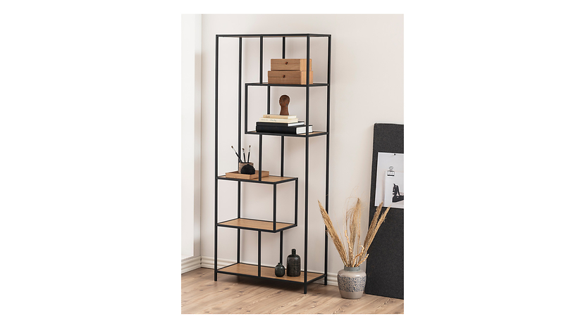 „Seaford“ knygų lentyna – lofto stiliaus siluetas. Dizainas ir funkcionalumas: „Seaford“ knygų lentyna derina modernią estetiką ir praktiškumą. Dėl 185 cm aukščio ir atviros konstrukcijos ji puikiai tinka erdvioms svetainėms, biurams ir komercinėms erdvėms. Išskirtinės, netaisyklingai išdėstytos lentynos sukuria dinamišką kompoziciją, atkreipia dėmesį ir leidžia kūrybiškai eksponuoti knygas, dekoracijas ar augalus. Matinis laukinio ąžuolo rėmas puikiai papildo juodo plieno rėmą, pabrėždamas knygų lentynos industrinį stilių. Dėl tvirtos konstrukcijos lentyna ne tik gerai atrodo, bet ir yra patvari bei stabili – paruošta intensyviam naudojimui. Specialios savybės: Matmenys: 77x35x185 cm – aukšta ir erdvi forma. Modernus lofto stilius – matinis laukinis ąžuolas + plieninis rėmas. Netaisyklingas lentynų išdėstymas – dekoratyvus išdėstymas. Stabili, plieninė konstrukcija – patvari daugelį metų. Puikiai tinka svetainei, biurui, darbo kambariui ar komercinei erdvei. Santrauka: Aukšta „Seaford“ lentyna yra puikus pasirinkimas lofto stiliaus entuziastams ir tiems, kurie vertina funkcionalų dizainą. Ji suteikia puikų pagrindą daiktams laikyti ir eksponuoti, o jos dekoratyvinė forma pagerina bet kokio interjero estetiką. Taip pat peržiūrėkite kitus „Seaford“ kolekcijos baldus, kad sukurtumėte darnų, charakteringą išdėstymą.