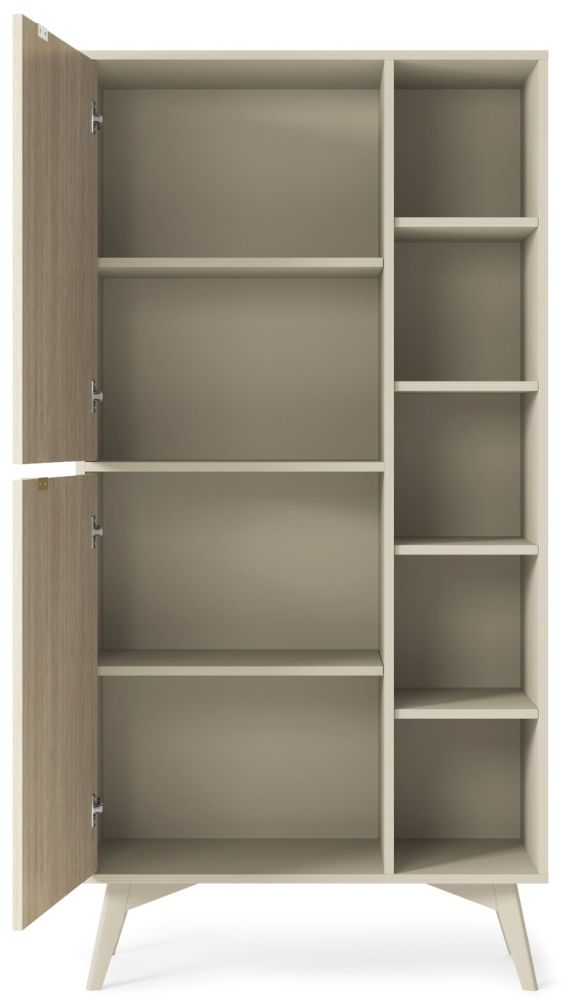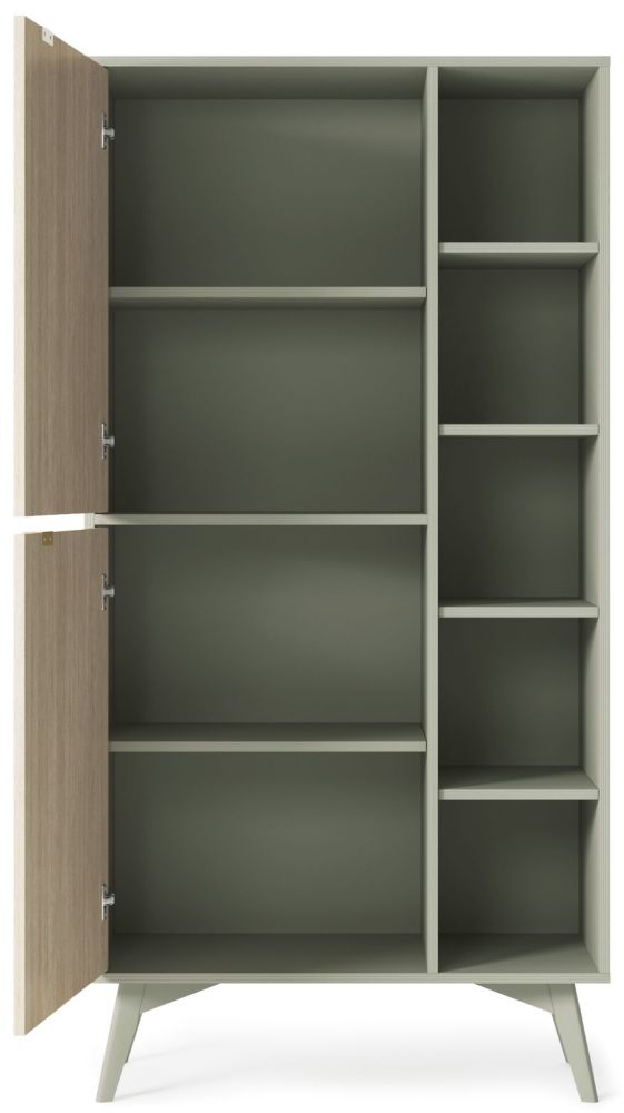 „Forest RG80“ knygų lentyna su eglutės raštu – turi du priekius, lentynas už jų ir papildomą erdvę su lentynomis.