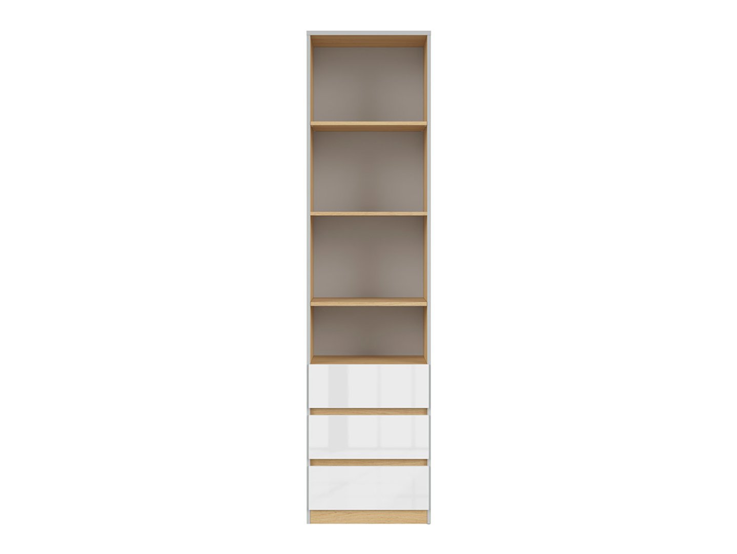 NANDU knygų lentyna su 3 stalčiais, 50 cm, šviesiai pilka/poliruoto ąžuolo/blizgios baltos spalvos