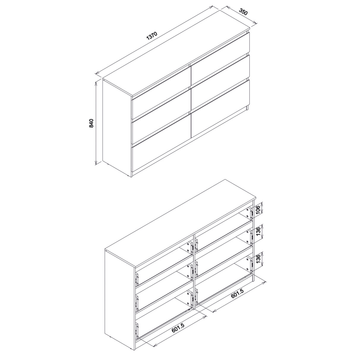 Plotis 137 cm Gylis 35 cm Aukštis 84 cm Produkto svoris su pakuote 53,6 kg Gamintojo kodas / simbolis RM03 Kolekcijos pavadinimas REMI Produkto pakuočių skaičius 2 Stilius Moderni įranga Surinkimo instrukcijos / surinkimo priedai Surinkimas Savarankiškam surinkimui Stalviršio medžiaga / tipas / storis laminuota medžio drožlių plokštė 16 mm Korpuso medžiaga / tipas / storis Laminuota medžio drožlių plokštė 16 mm Priekinė medžiaga / tipas / storis Laminuota medžio drožlių plokštė 16 mm Priekinė rankena / tipas / spalva frezuota Stalčių bėgeliai rutulinis guolis Kojelė / tipas / spalva cokolis Stalčių skaičius 6