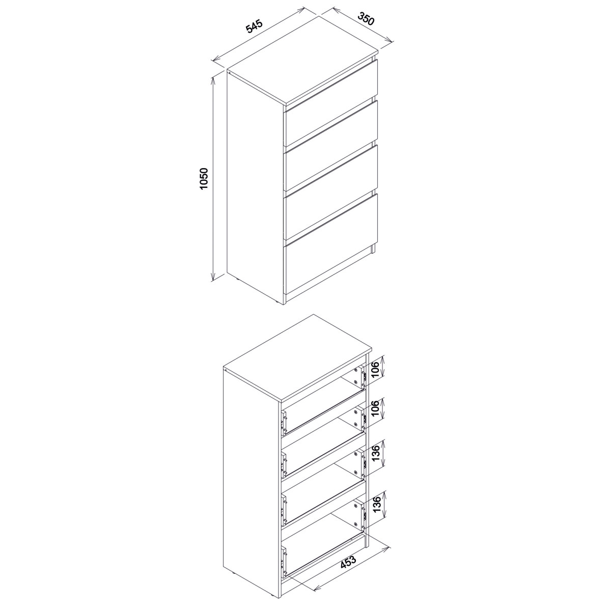 Plotis 54,5 cm Gylis 35 cm Aukštis 105 cm Produkto svoris su pakuote 56,45 kg Gamintojo kodas / simbolis RM04 Kolekcijos pavadinimas REMI Produkto pakuočių skaičius 2 Stilius Moderni įranga Surinkimo instrukcijos / surinkimo priedai Surinkimas Savarankiškam surinkimui Stalviršio medžiaga / tipas / storis laminuota medžio drožlių plokštė 16 mm Korpuso medžiaga / tipas / storis Laminuota medžio drožlių plokštė 16 mm Priekinė medžiaga / tipas / storis Laminuota medžio drožlių plokštė 16 mm Priekinė rankena / tipas / spalva frezuota Stalčių bėgeliai rutulinis guolis Kojelė / tipas / spalva cokolis Stalčių skaičius 4