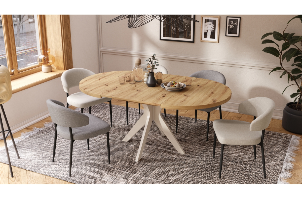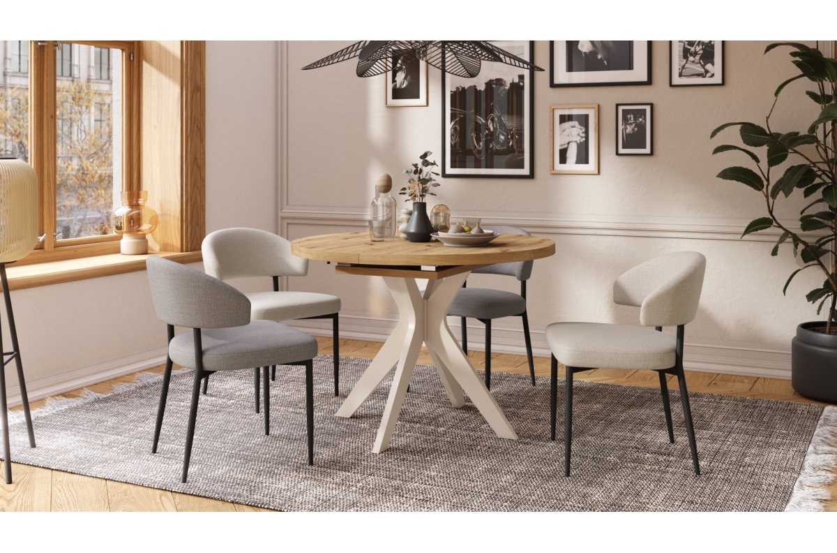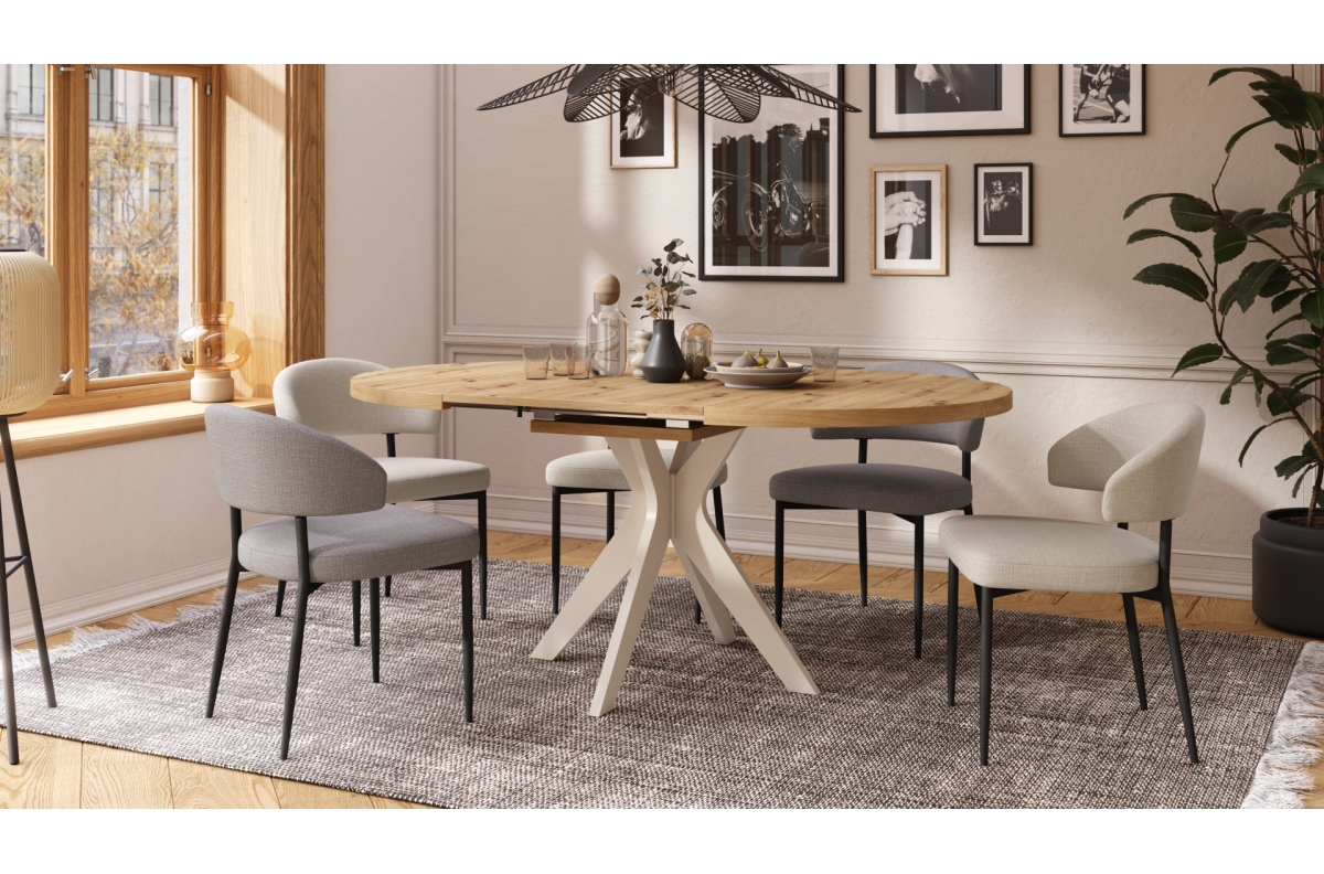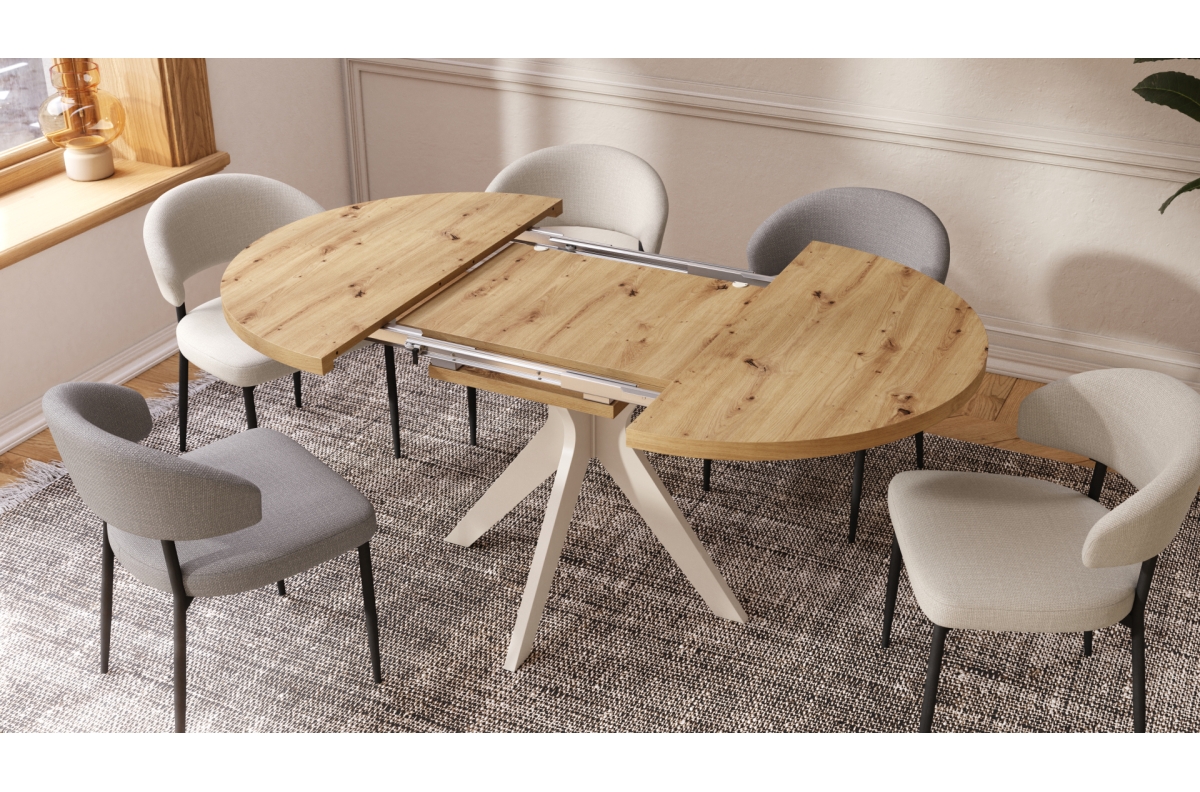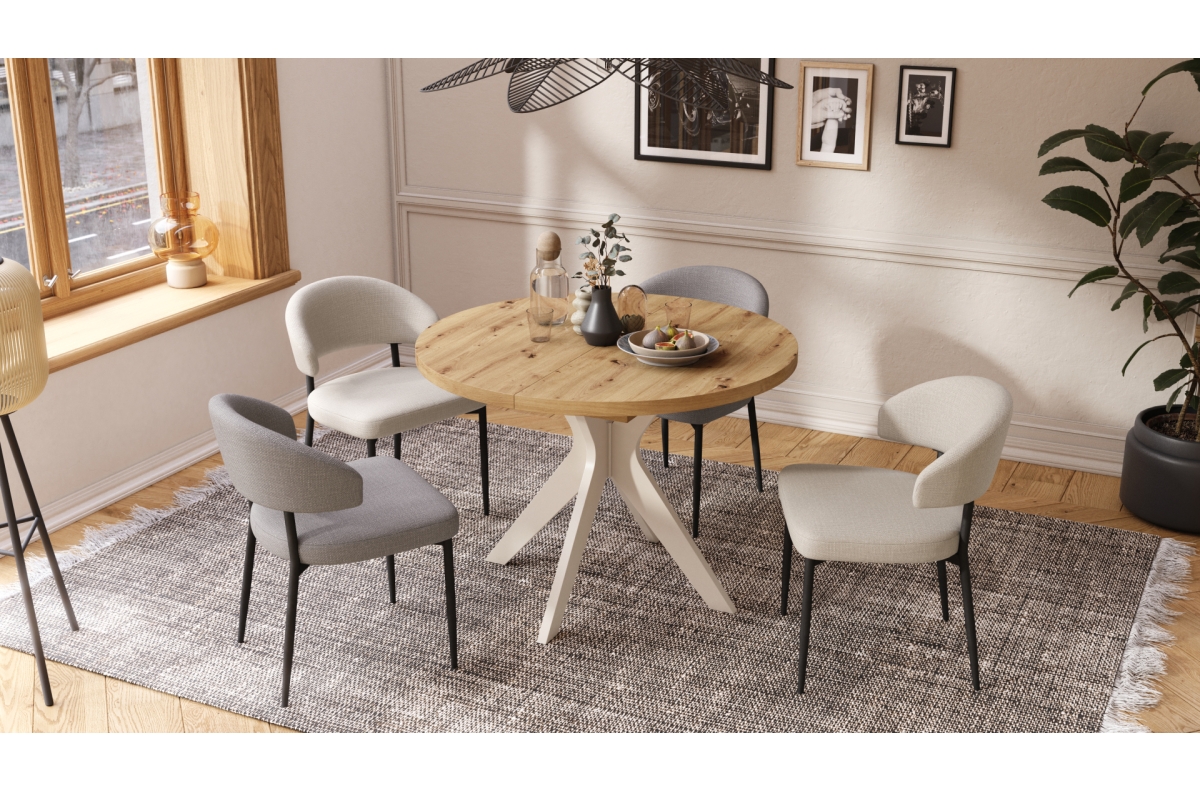 RENZO Artisan ąžuolo/smėlio (šampano) spalvos kojos – APVALUS STALAS Ø110, IŠPLĖSTAMAS IKI 180 CM | VIRTUVEI VALGOMAJAM SVETAINEI RETRO STILIUS