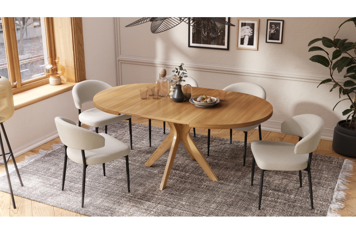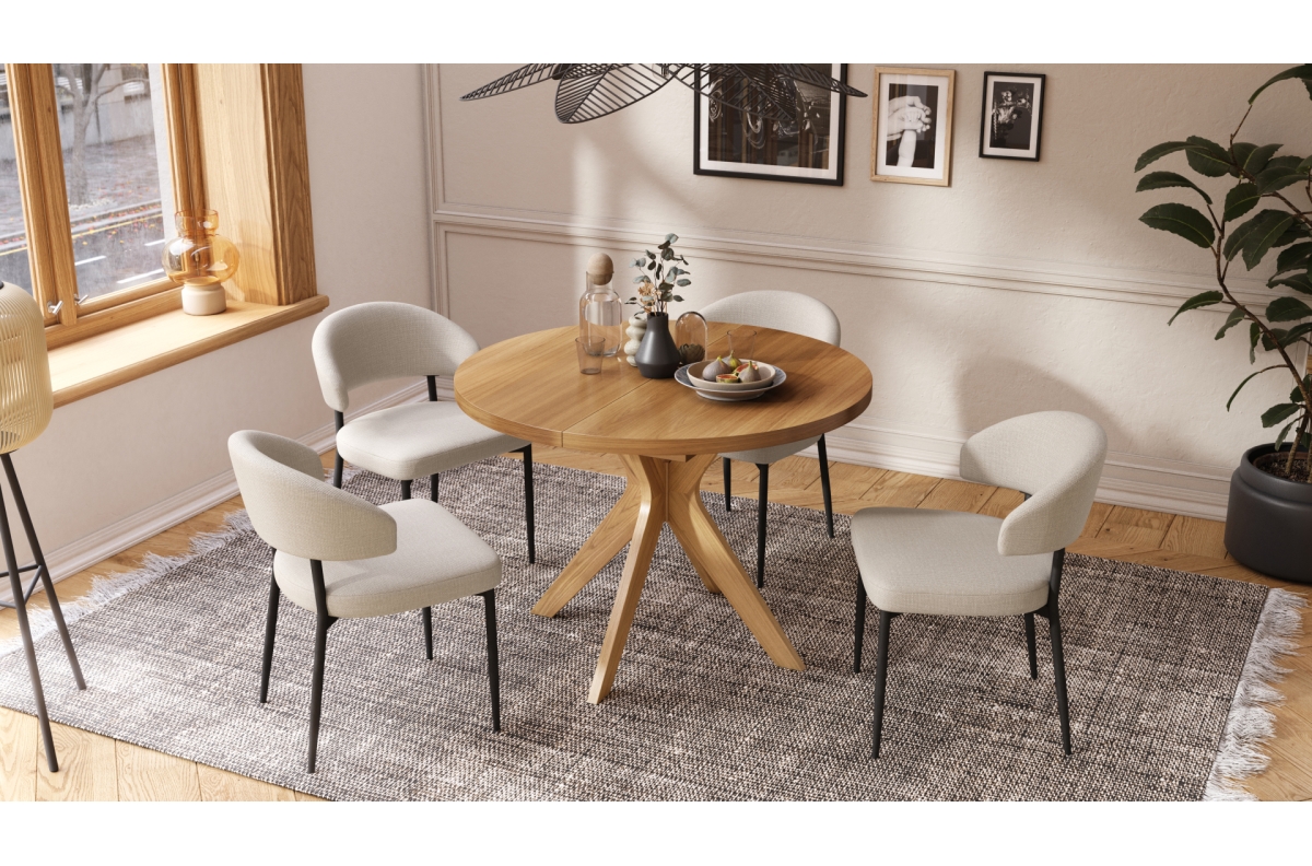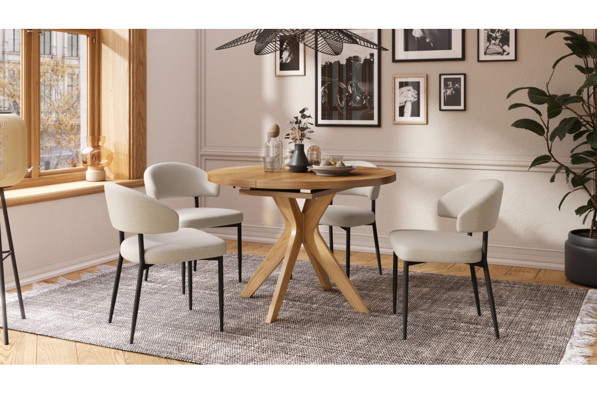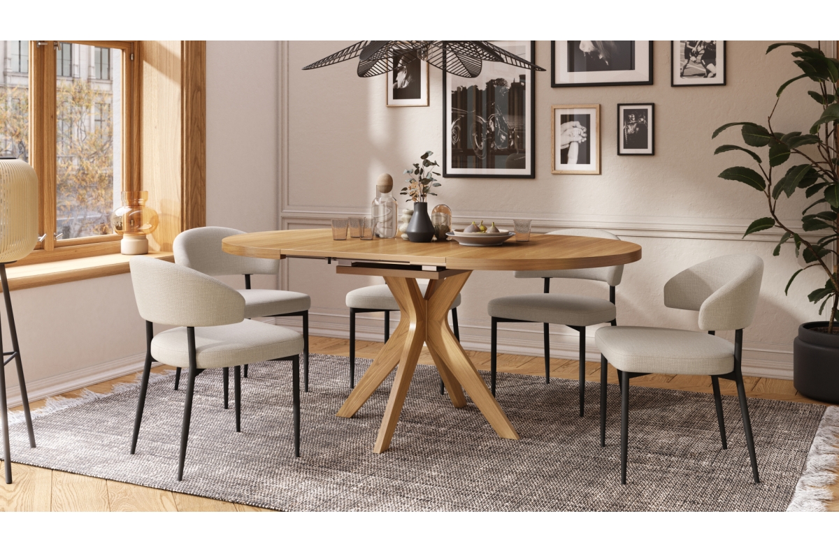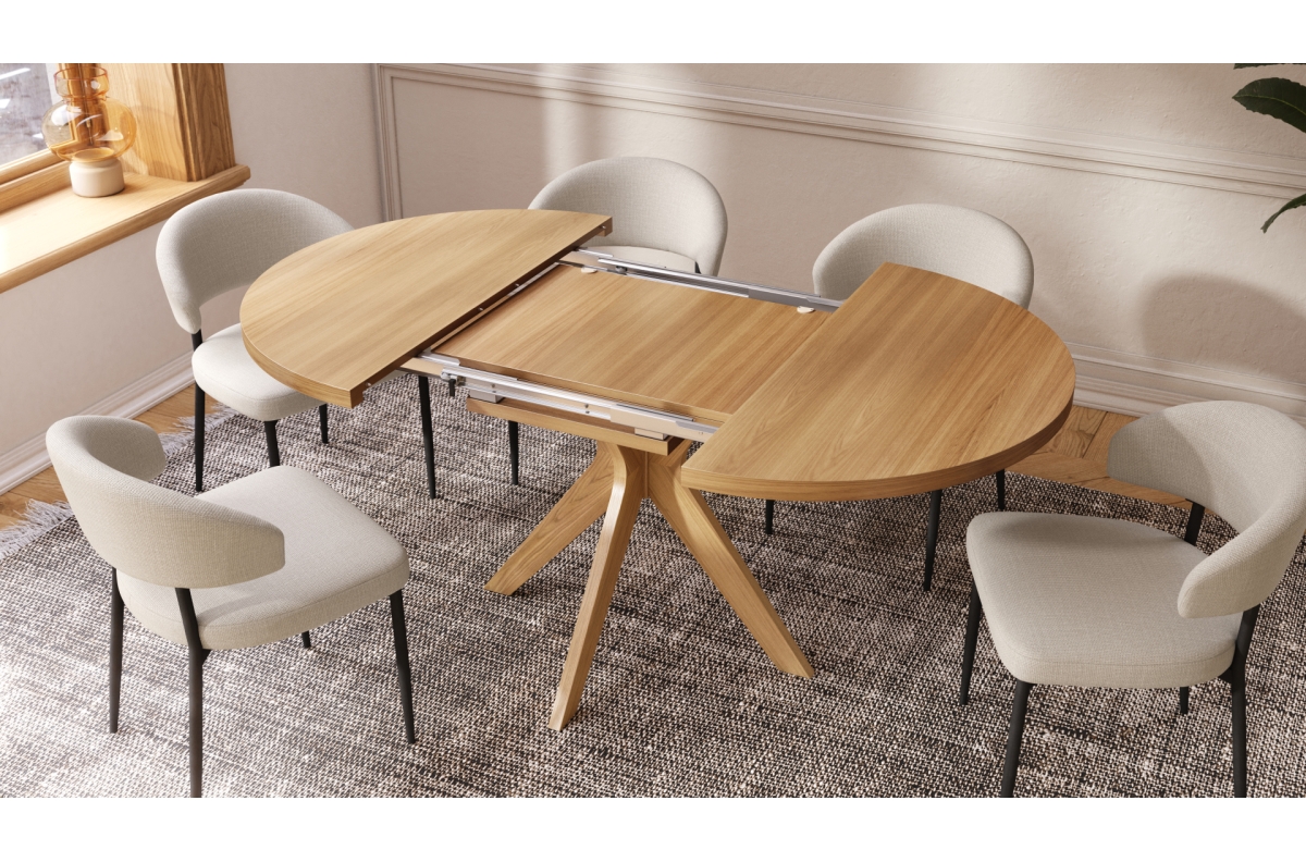 RENZO stalas – elegantiškas ir FUNKCIONALUS, pasižymintis nesenstančiu dizainu. Apvalų stalviršį galima lengvai prailginti dėl sumaniai paslėpto, “sulankstomo” prailginimo įdėklo, kuris nenaudojant pasislepia po apačia. Tai suteikia stalui universalumo – kasdien naudojant jis užima minimaliai vietos, o prireikus greitai transformuojasi į didesnį stalą, puikiai tinkantį susibūrimams su šeima ar draugais.