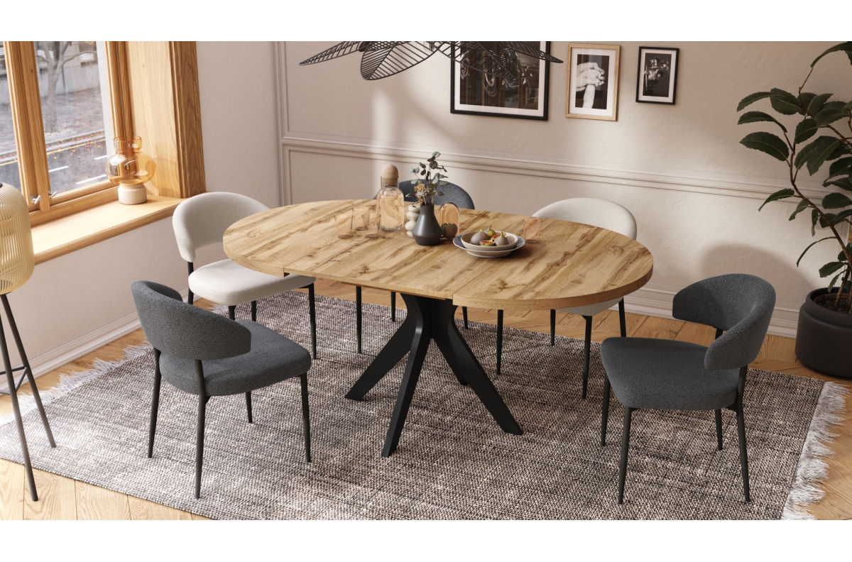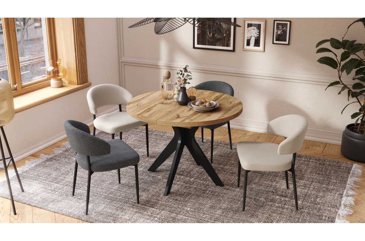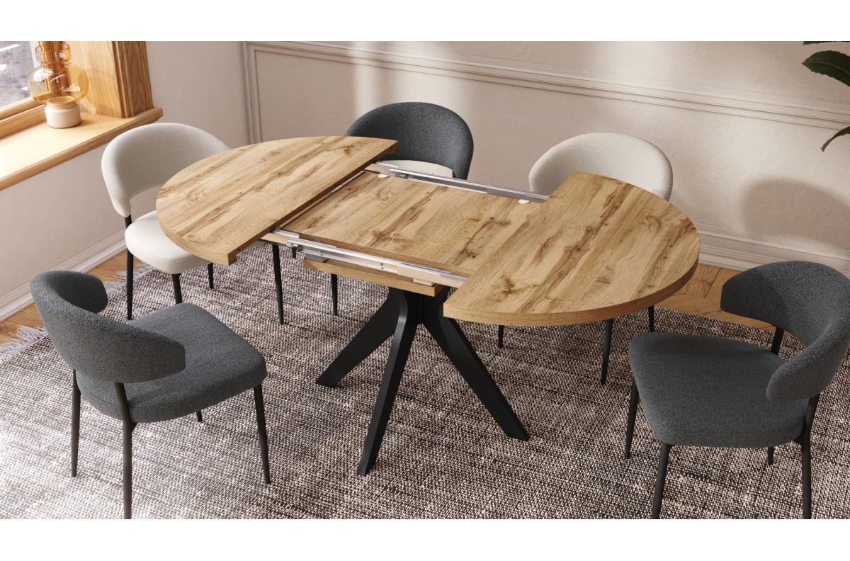 RENZO Wotan ąžuolo/juodos kojos – APVALUS STALAS Ø110, IŠTRAUKIAMAS IKI 180 CM | VIRTUVEI VALGOMAJAM SVETAINEI RETRO