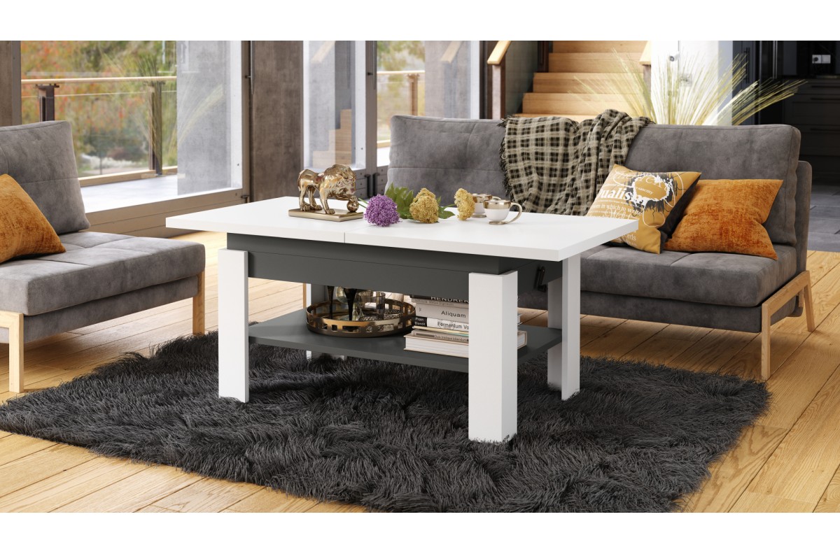 Kavos staliukas pagamintas iš matinės medžio drožlių plokštės, laminuotos iš abiejų pusių, 28 mm storio (viršus) ir 18 mm storio (kiti elementai), apdailintos 1 mm ABS kraštais.