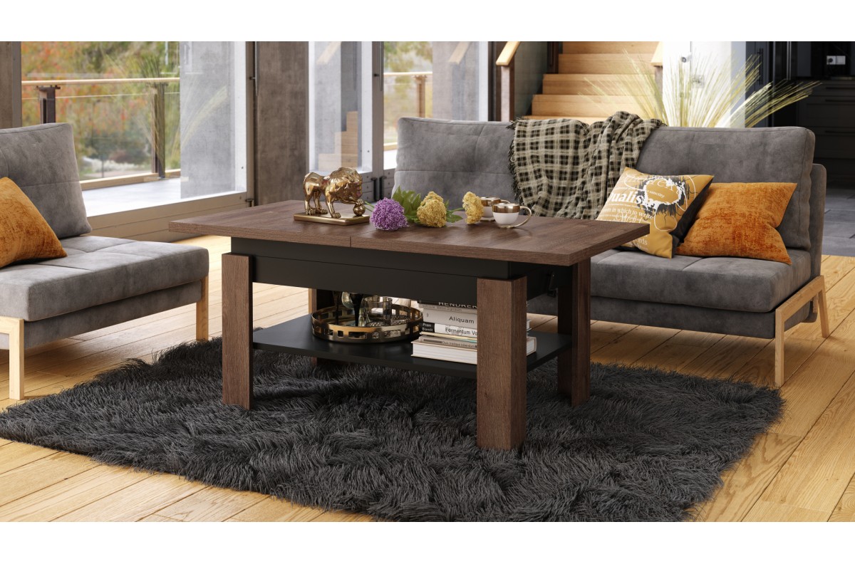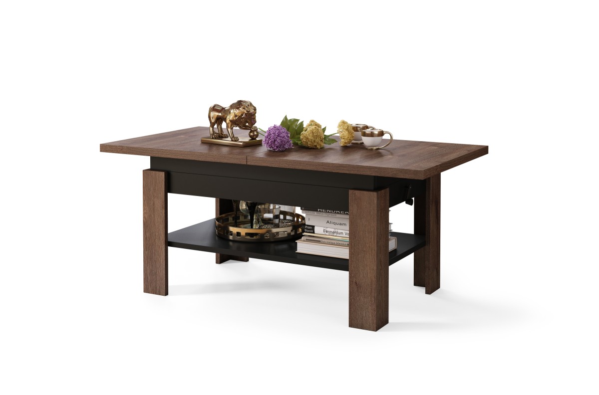 RIO rudas ąžuolas/matinė juoda – sulankstomas, pakeliamas kavos staliukas su lentyna
