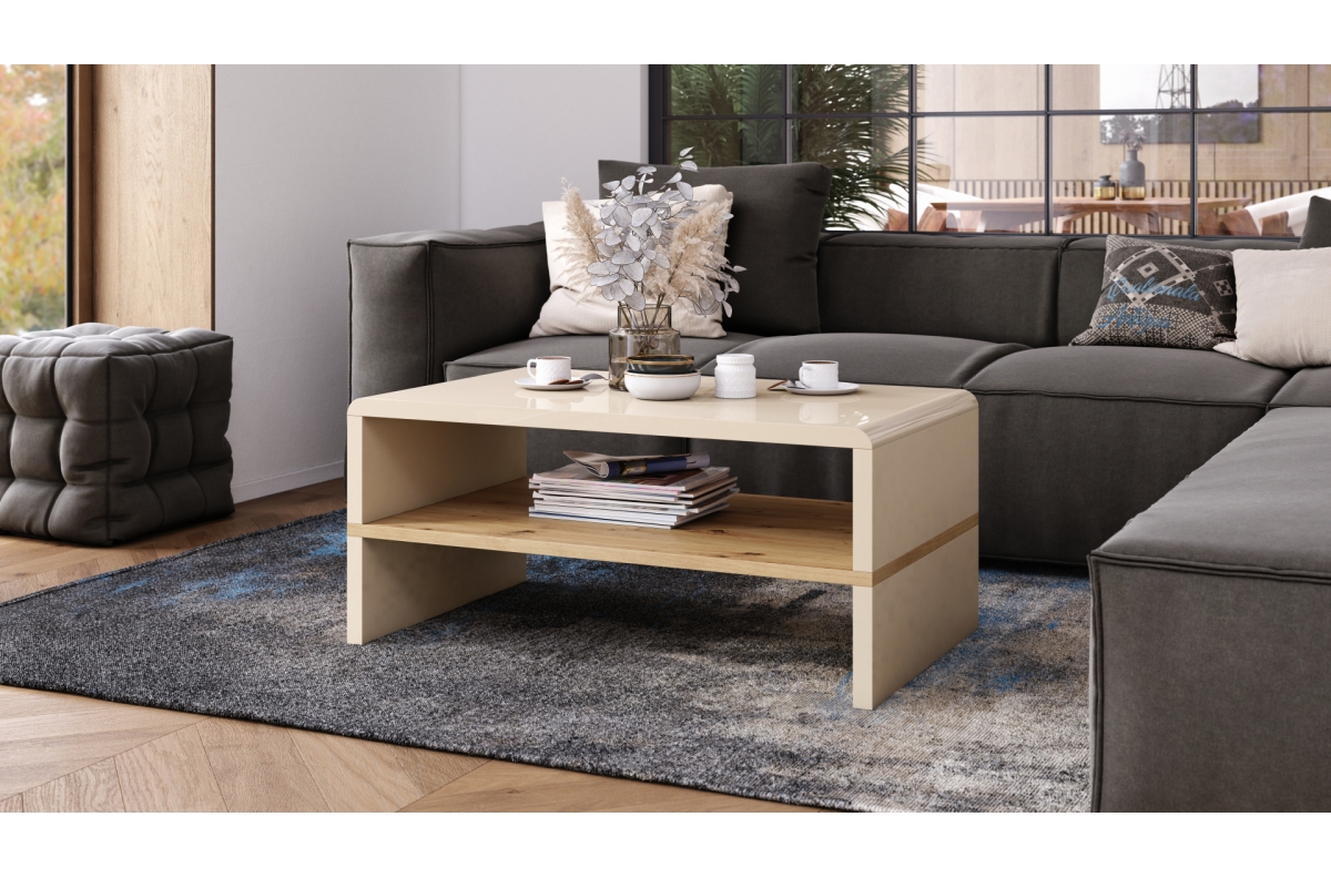 ROCK smėlio spalvos blizgios / artisan ąžuolo spalvos – MODERNUS SVETAINĖS KAVOS STALIUKAS SU LENTYNA
