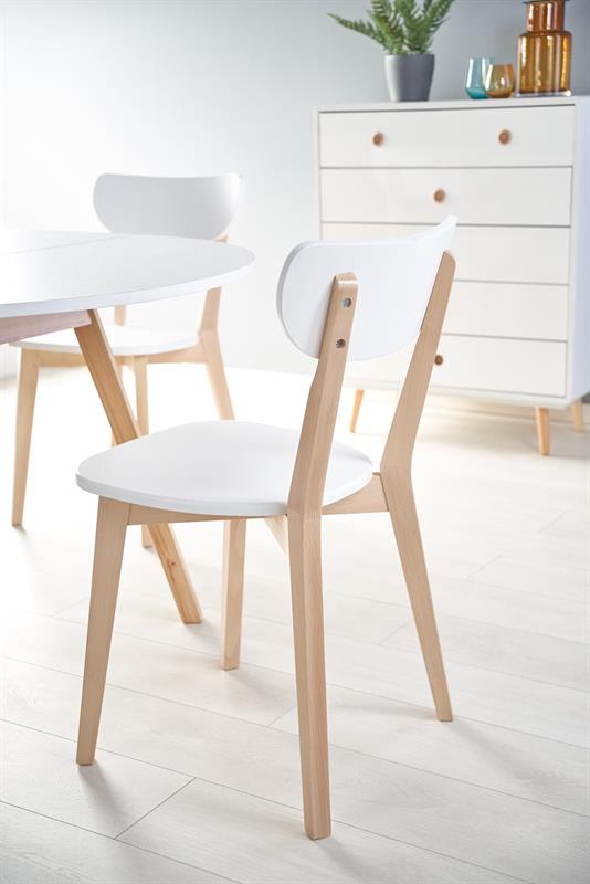 Matmenys: 102-142/102/73 cm, prailginamas stalas, medžiaga: laminuota MDF / masyvi mediena – bukas, spalva: stalviršis – balta, kojos – medaus ąžuolas