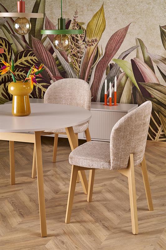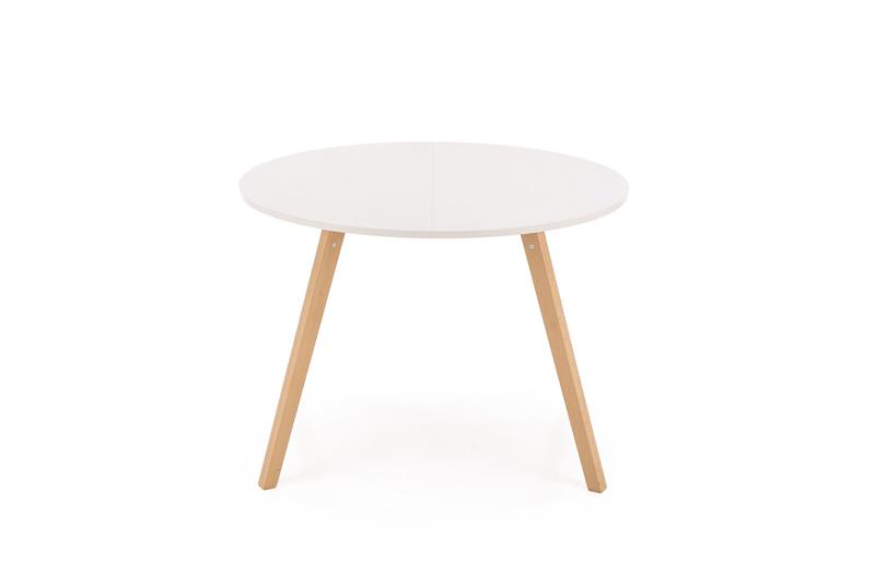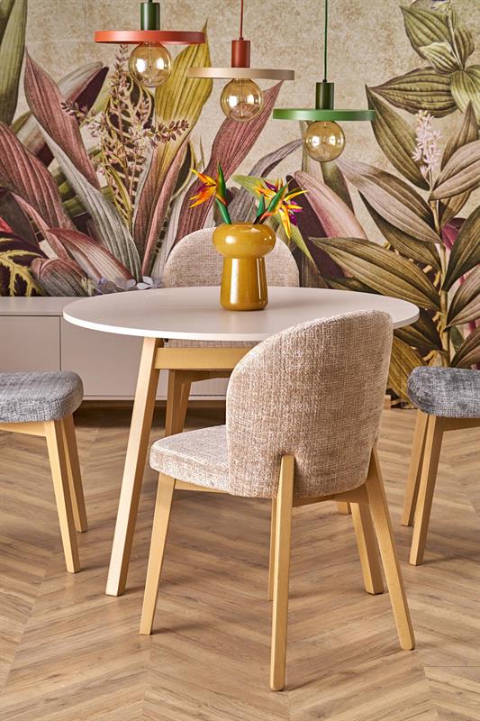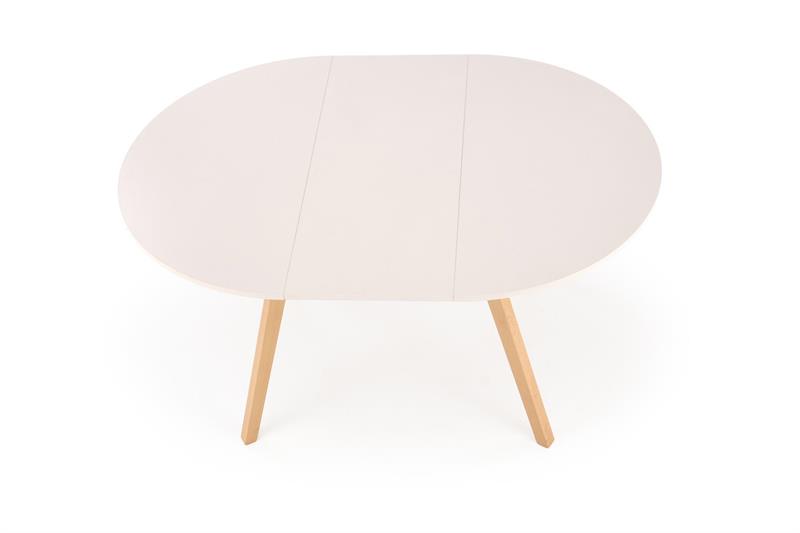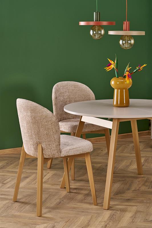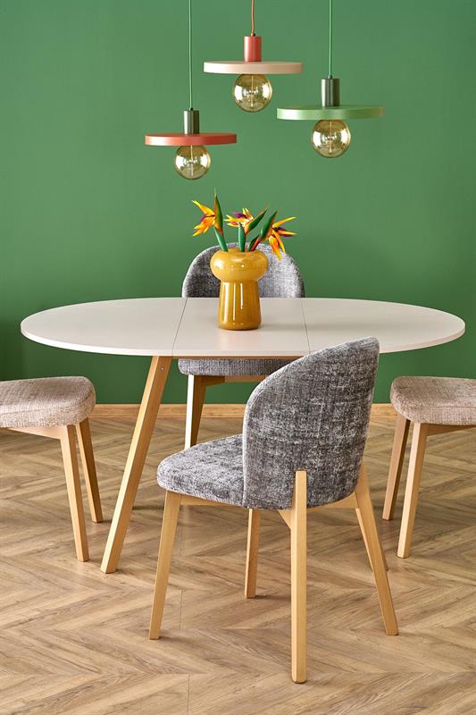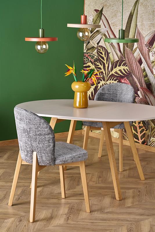 Matmenys: 102-142/102/73 cm, prailginamas stalas, medžiaga: laminuota medžio drožlių plokštė / buko masyvas, spalva: stalviršis – kašmyras, kojelės – natūralios