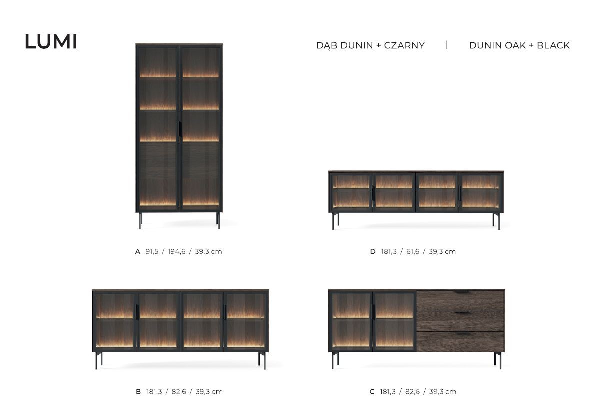 Šioje kolekcijoje yra dvi komodos, vitrina ir televizoriaus staliukas – ieškokite Lumi.