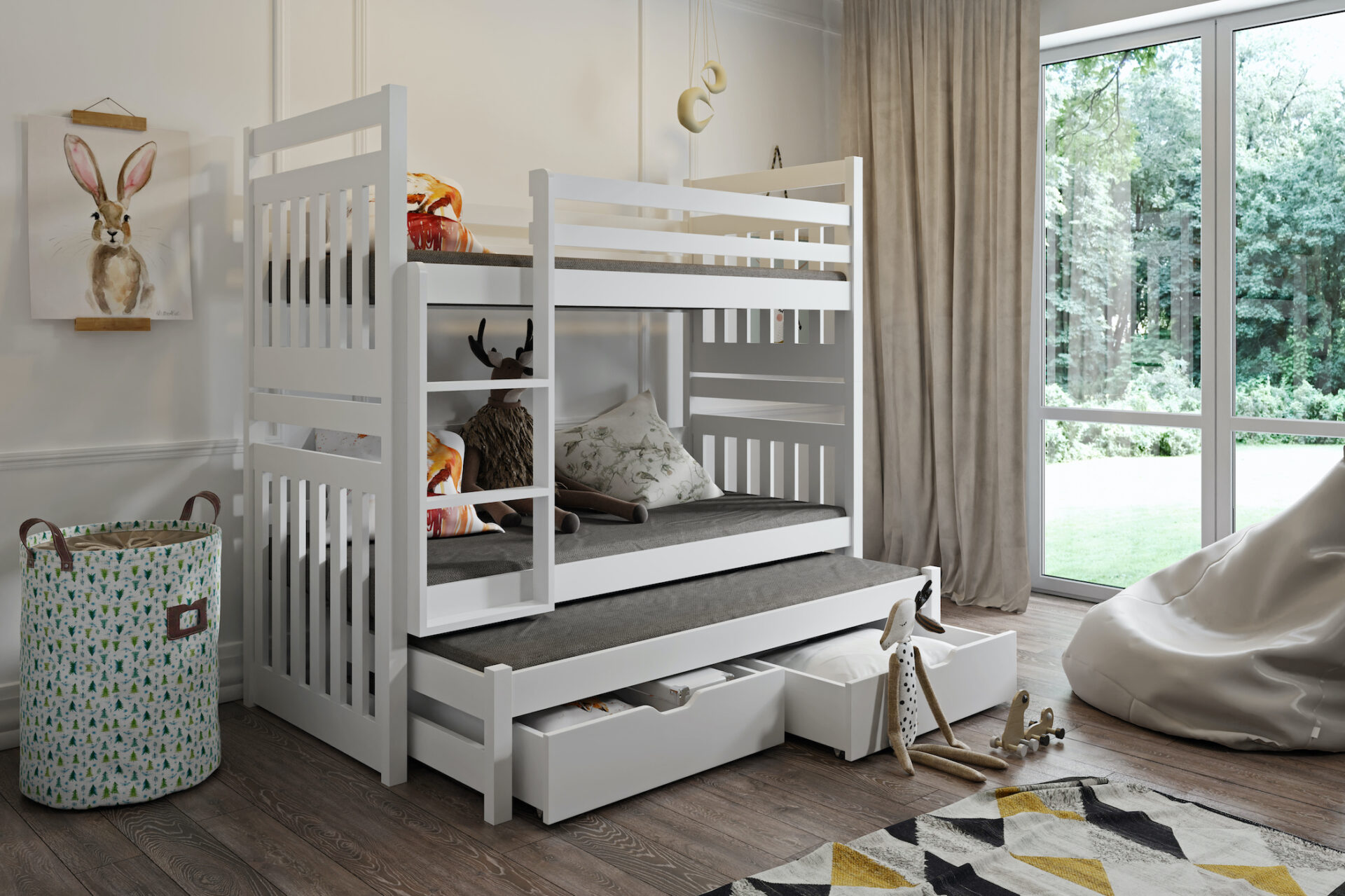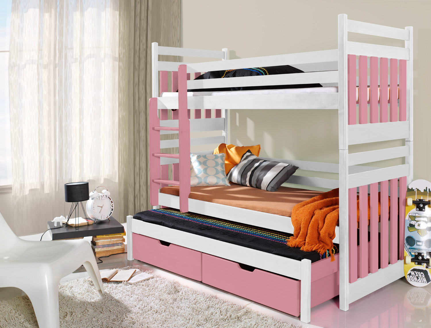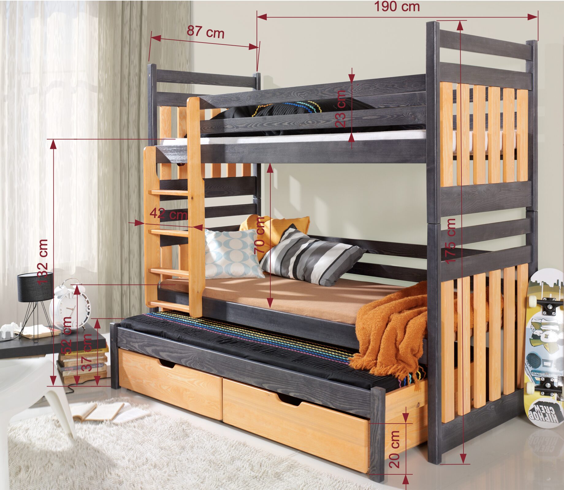 SAMBOR III trivietė dviaukštė lova su stalčiais 90×200 cm