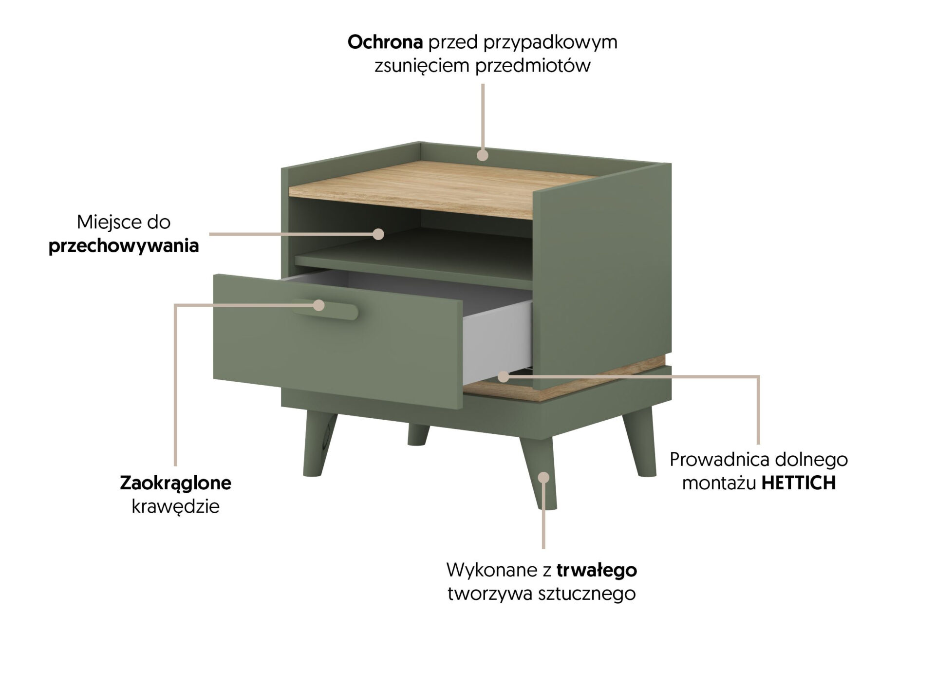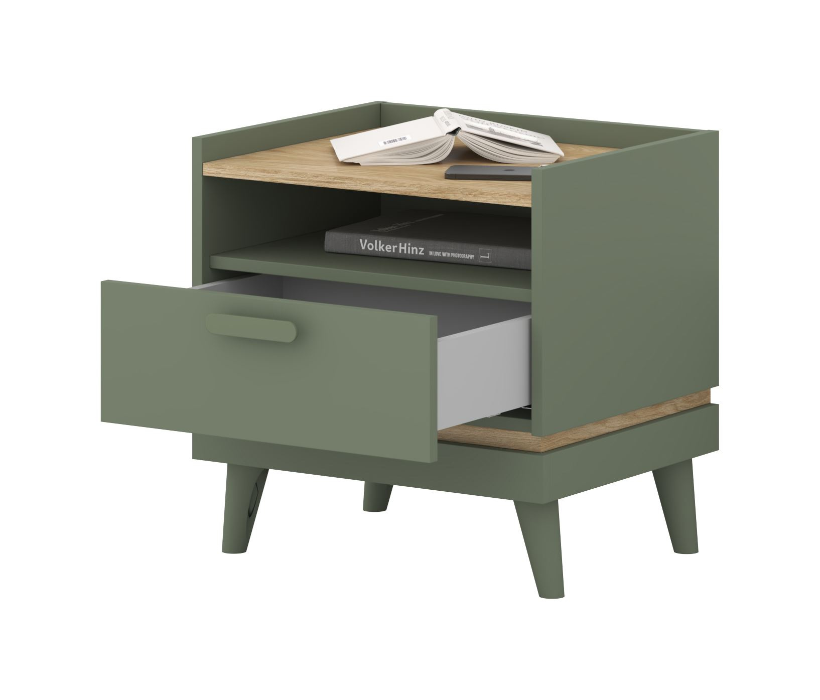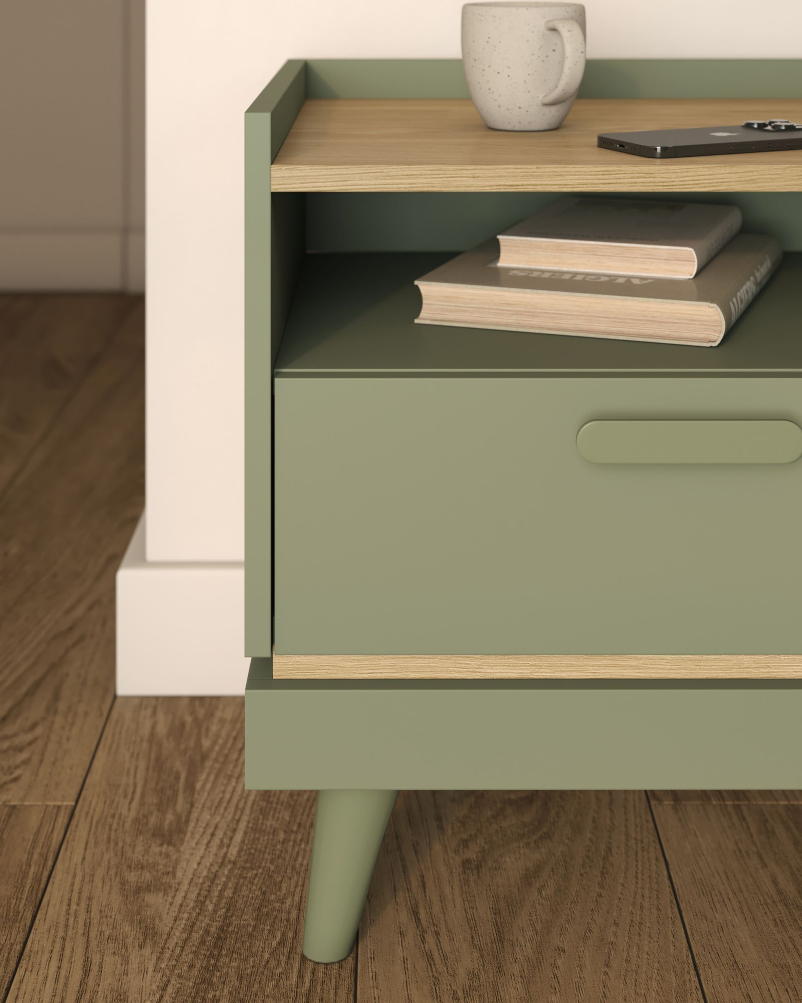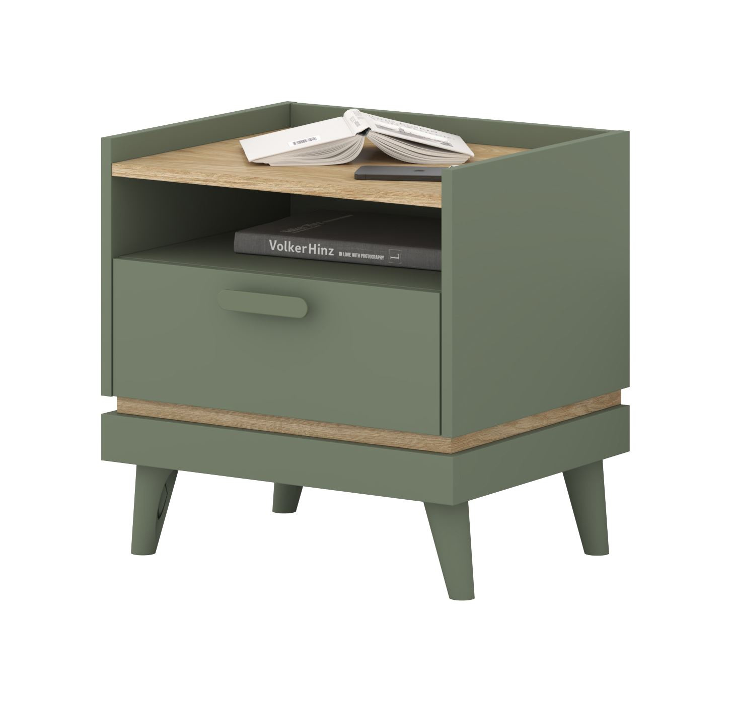 Scandi – 1S naktinis staliukas, dulkėta žalia, alyvuotas ąžuolas