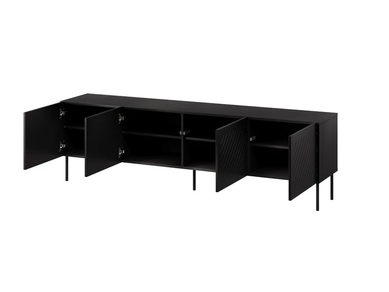 Šis baldas būtų elegantiškas ir modernus, puikiai tinkantis minimalistiniam interjerui. Juoda apdaila suteiktų klasės, o frezuotas fasadas – įdomios tekstūros. Kojelės suteiktų spintelei lengvumo ir subtilumo, o tai atitinka šiuolaikines interjero dizaino tendencijas.