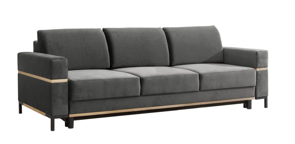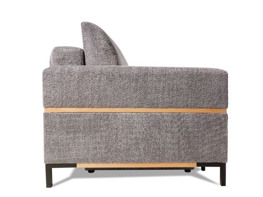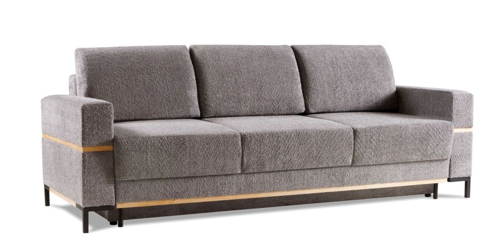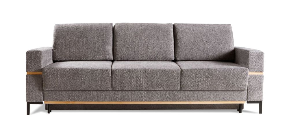 Sofa pasižymi juodo metalo kojelėmis ir mediniais dekoratyviniais elementais.