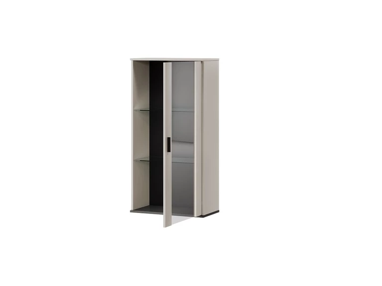 Spintelė atsidaro į šoną, o už priekinės dalies yra dvi stiklinės lentynos, puikiai tinkančios eksponuoti stiklinius indus, porcelianą ar dekoratyvinius aksesuarus. Juoda galinė panelė ir juoda apatinė vidinė dalis gražiai išryškina viduje esančius daiktus, suteikdamos visai konstrukcijai gylio ir elegancijos.