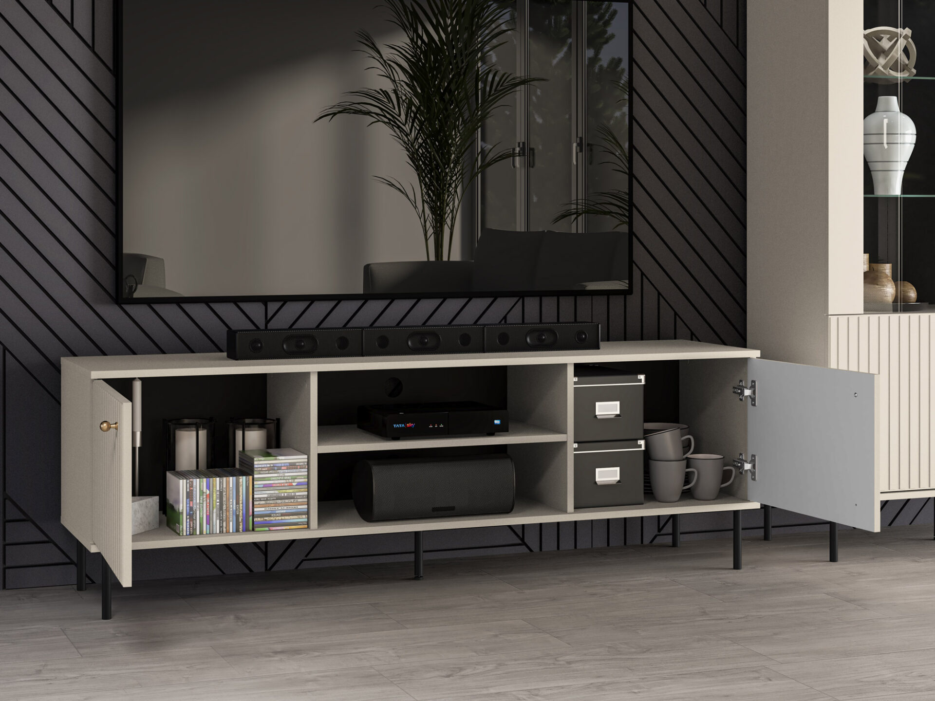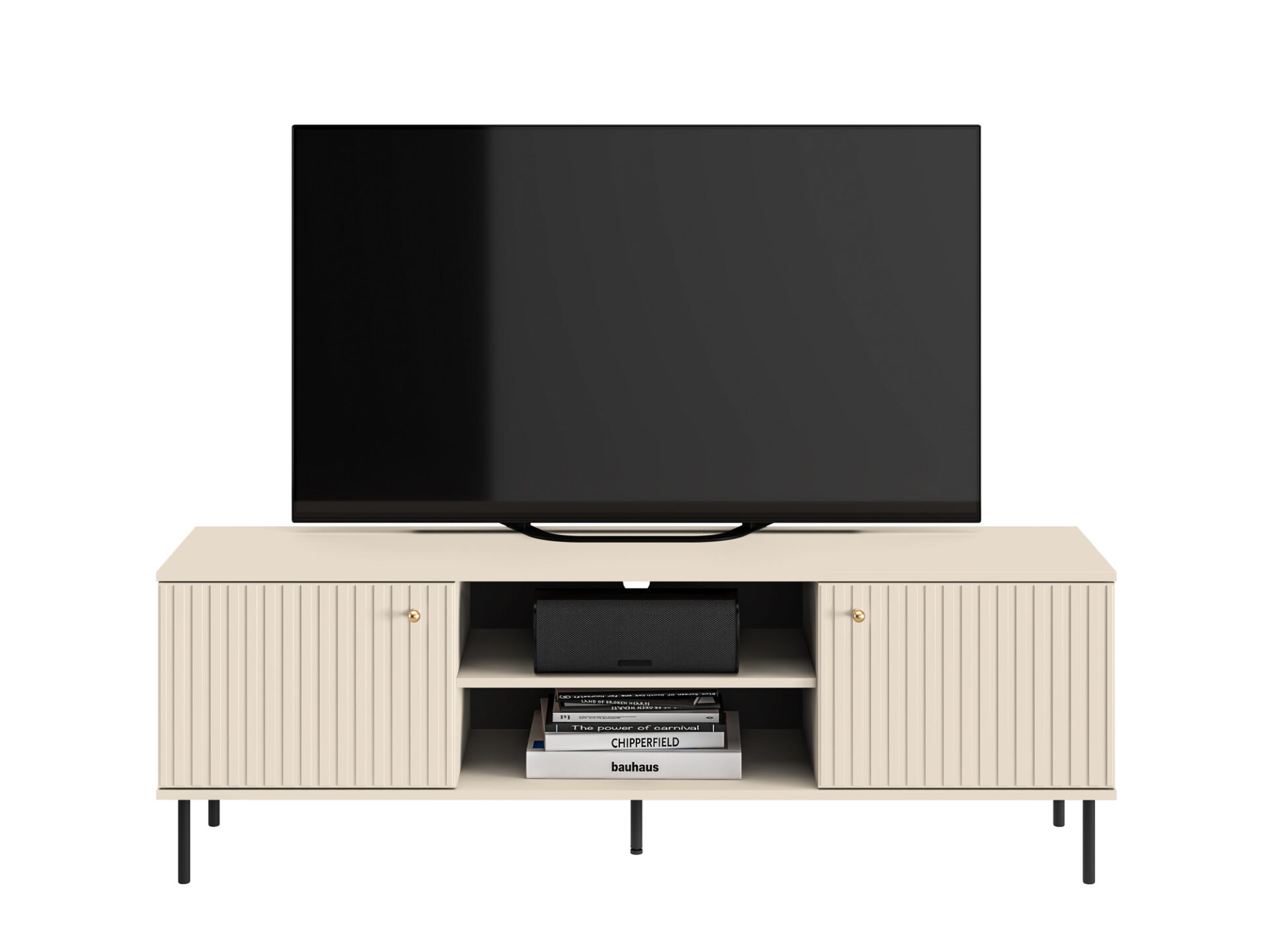 „Sophie 06“ televizoriaus staliukas – puikus baldas jūsų televizoriui. Dvi uždaros nišos sukuria daug vietos daiktams susidėti, o atviros lentynos ir platus stalviršis leidžia lengvai susitvarkyti multimedijos įrangą. „Sophie 06“ siūlo daugiau nei vien funkcionalumą. Mūsų baldas yra šiuolaikinės elegancijos sinonimas. Kašmyro dekoro detalės, frezuoti MDF fasadai, šlifuoto aukso spalvos rankenėlės ir diskretiškos juodos kojelės – tai visos „Sophie“ kolekcijos esmė.