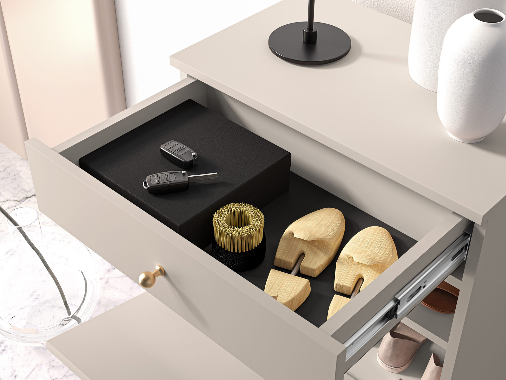 • Pilno ištraukimo bėgeliai, kad būtų lengva pasiekti stalčiuje esančius daiktus.