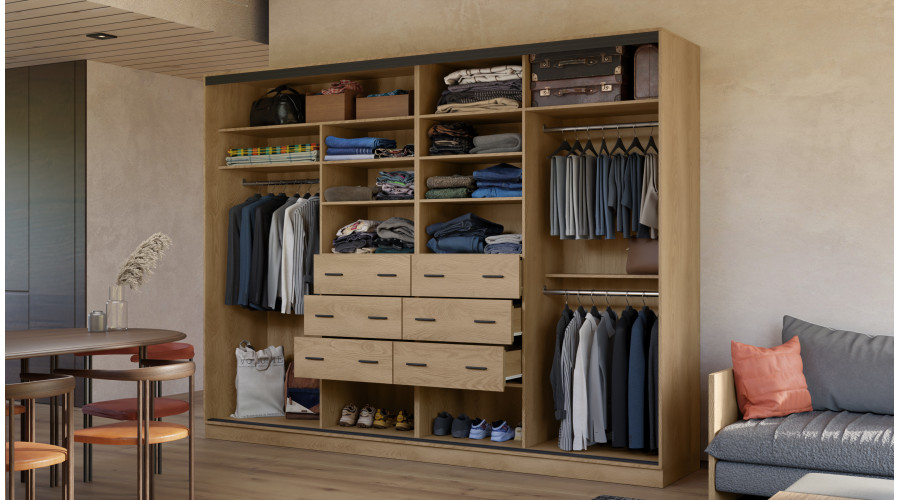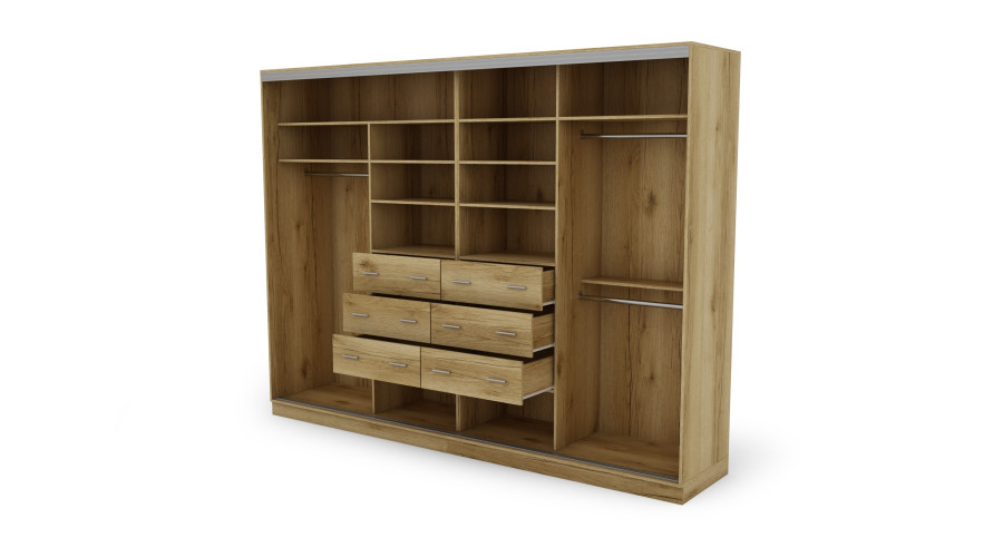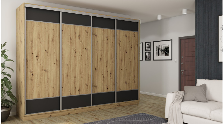 Dėl elegantiškų fasadų 4D/320 stumdoma spinta puikiai tinka miegamajam. Veidrodis vizualiai padidina erdvę ir suteikia papildomos šviesos. Minimalistinis dizainas sklandžiai dera su įvairiais interjerais, o prieinamos spalvos puikiai papildo modernų dekorą. Praktiškas spintos vidus leidžia lengvai rūšiuoti drabužius, todėl nereikia vargti tvarkant garderobą.