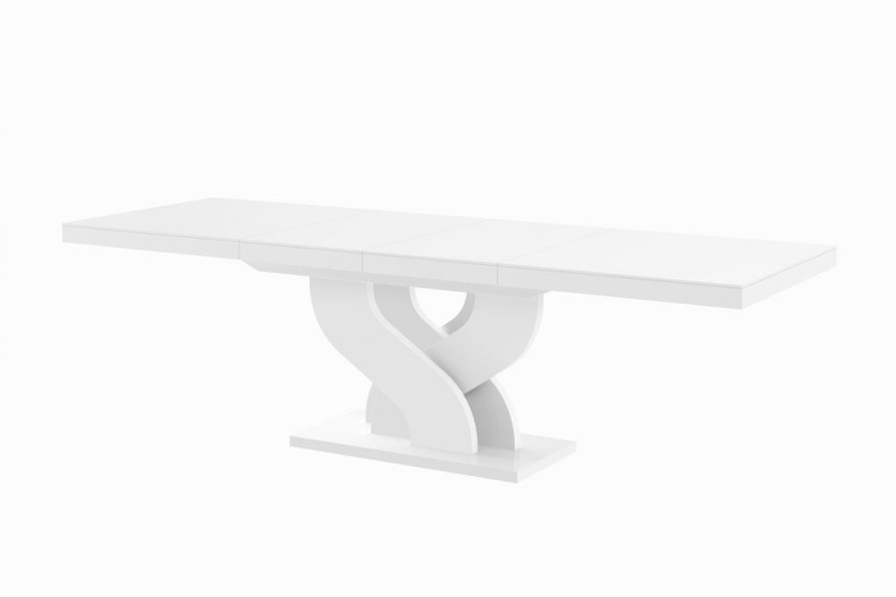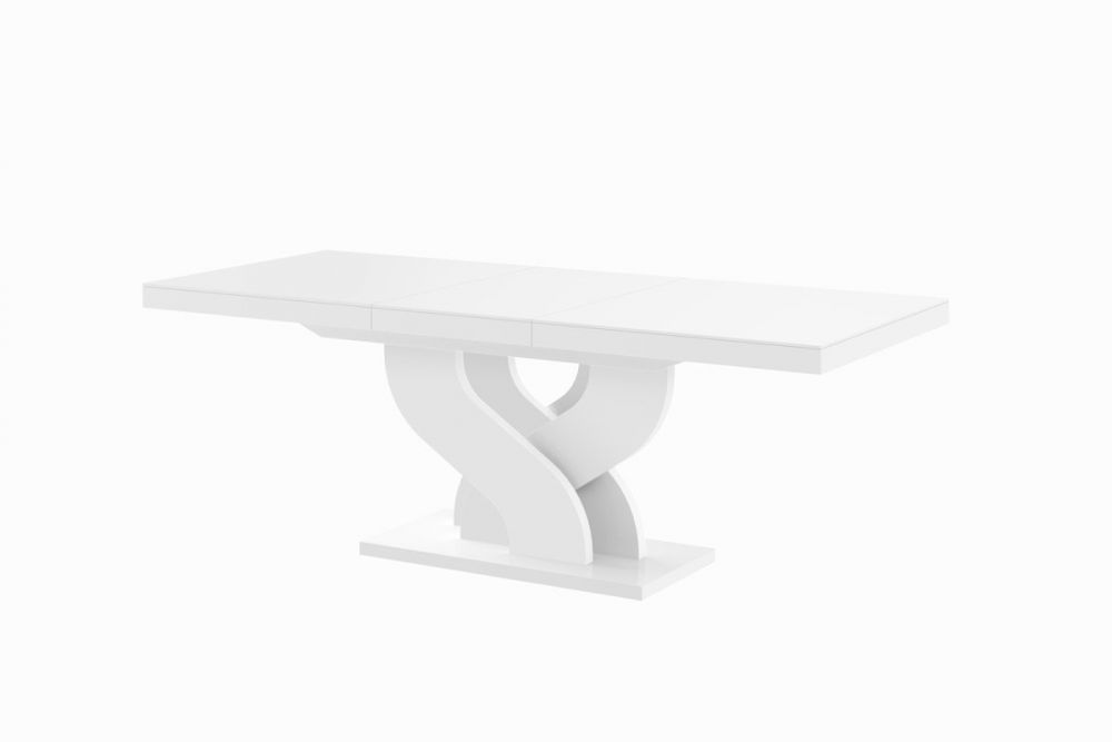 Lenkijoje pagamintas BELLA stalas žavi įdomia pagrindo forma, funkcionalumu ir kokybišku meistriškumu, todėl tai baldas, kuris tarnaus ilgus metus. Unikalus stalo pagrindas įkvėptas begalybės simbolio. Šio dizainerio valgomojo stalo balta spalvų gama puikiai atrodys tiek moderniame, tiek prabangiame interjere. Šis išskleidžiamas stalas pagamintas iš aukštos kokybės MDF plokštės, padengtos blizgiu akriliniu kilimėliu, suteikiančiu elementams veidrodinę išvaizdą. Lenta pasižymi padidintu atsparumu įbrėžimams ir UV spinduliams. Valgomojo stalas turi sinchroninius rutulinius guolius, leidžiančius greitai ir lengvai išskleisti stalviršį. Tiesiog švelniai patraukite vieną stalviršio pusę, ir kita išsklės vienu metu. Po stalviršiu yra du prailginimai, skirti stalo ilgiui pailginti. BELLA stalą galima išskleisti iki 208 cm arba 256 cm, todėl prie jo gali tilpti maždaug 10 žmonių. Produkto savybės