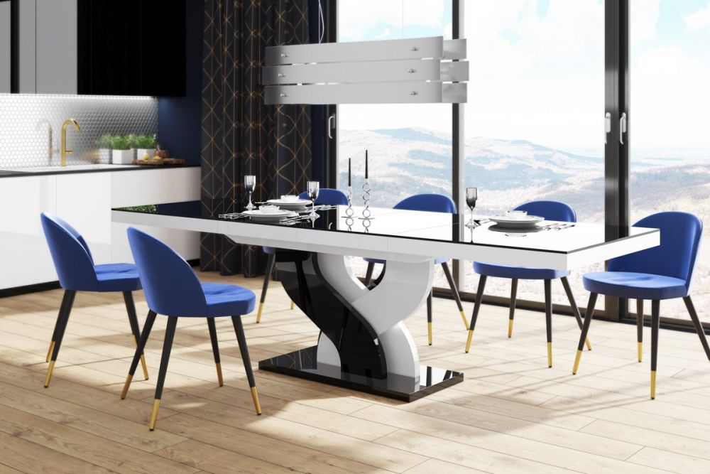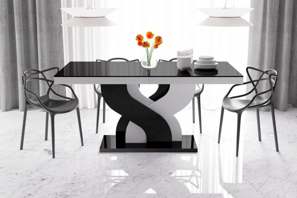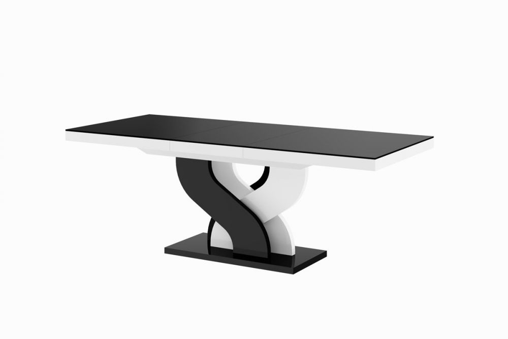 BELLA stalas pagamintas iš MDF plokštės, padengtos akriliniu kilimėliu, kuris suteikia blizgų, į veidrodį primenantį paviršių. Plokštė pasižymi padidintu atsparumu įbrėžimams ir UV spinduliams. Siekiant išlaikyti aukštą stalo kokybę, gamintojas rekomenduoja naudoti padėkliukus. Šis Lenkijoje pagamintas valgomojo stalas žavi savo įdomiu dizainu, ypač rafinuotu pagrindu, įkvėptu begalybės simbolio. Madinga ir nesenstanti juodos ir baltos spalvų gama puikiai atrodys beveik bet kokiame interjere. Dizainerio BELLA stalas turi sinchroninius rutulinius guolius, todėl stalo prailginimas yra labai paprastas. Tiesiog švelniai patraukite stalviršį iš vienos pusės, ir kita pradės ilgėti vienu metu. Po stalviršiu yra du prailginimai, leidžiantys prailginti stalviršį iki dviejų ilgių: 208 cm ir 256 cm. Produkto savybės