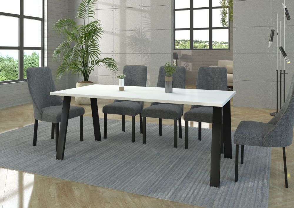 „Kleo“ pramoninio lofto stiliaus stalas bet kokiam interjerui suteiks charakterio ir elegancijos. Stalviršis pagamintas iš 28 mm storio laminuotos plokštės su matine balta apdaila. Kojos padengtos milteliniu būdu dažytomis kojelėmis su tekstūruota matine juoda apdaila.