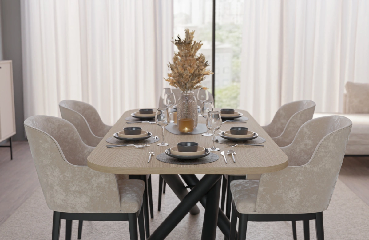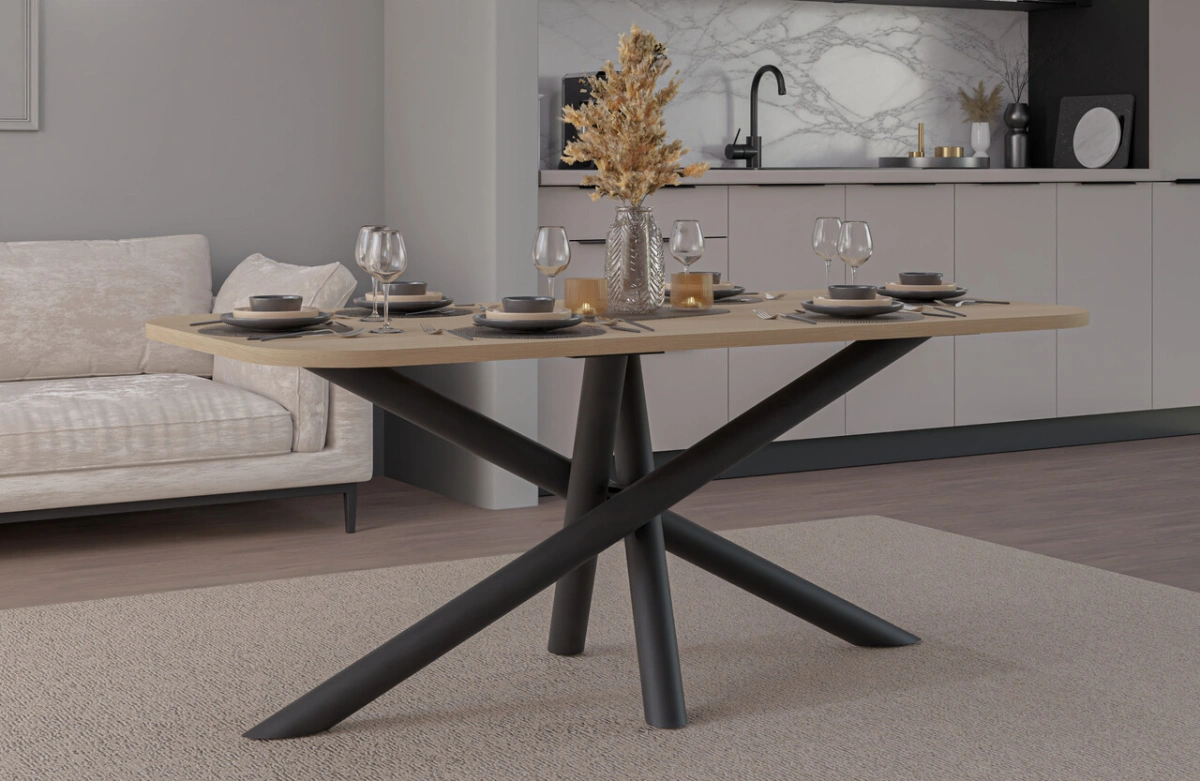 Modernių valgomojo stalų kolekcija, kurių stalviršiai pastatyti ant dekoratyvinių metalinių voratinklinių kojelių, pasižyminčių geometrine, šakota forma. Be estetinio patrauklumo, ši kojelių forma garantuoja tvirtą atramą net ir dideliems stalviršiams. Kartu su apvaliu arba ovaliu stalviršiu, kurį galima įsigyti keturių spalvų, visas baldas atrodo neįtikėtinai stilingai ir elegantiškai. OSLO stalai puikiai tinka modernaus, minimalistinio stiliaus, bet taip pat ir industrinio, prabangaus ar lofto stiliaus kambariams.