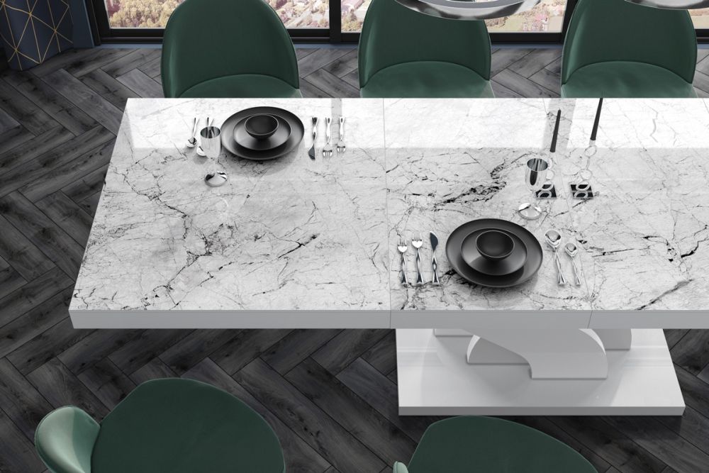 BELLA išskleidžiamas stalas 160(256)x89 baltas marmuras/balta blizgi
