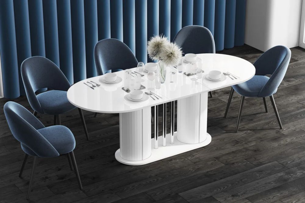 CESARO ištraukiamas valgomojo stalas puikiai tinka ieškantiems modernaus stalo, kuris papildytų jų interjero dizainą, bet svarbiausia, suteiktų daug erdvės šeimai ir svečiams susibūrimų metu. Pagamintas iš aukštos kokybės MDF plokštės, padengtos akriliniu kilimėliu, suteikiančiu jam elegantišką blizgesį, primenantį žvilgantį veidrodį, šis valgomojo stalas gali pasigirti ne tik patrauklia išvaizda, bet ir patvarumu. Dėl padidinto medžiagos atsparumo įbrėžimams, UV spinduliams ir aukštai temperatūrai iki 100 °C (212 °F), jis yra itin patvarus ir lengvai prižiūrimas. Gamintojas rekomenduoja švelniai valyti stalą šiek tiek drėgnu mikropluošto šluoste, nenaudojant ploviklių, kad jis ilgiau išlaikytų puikią išvaizdą. Stalas turi ovalaus paviršiaus prailginimą, todėl padidėja paviršiaus plotas dideliam kiekiui indų ir daugiau žmonių. Stalas turi sinchroninius rutulinius guolius, todėl jį nepaprastai lengva ir lengva prailginti. Tiesiog patraukite stalviršį iš vienos pusės, o kita išskleisis tuo pačiu metu. Ištraukiamas stalas tiekiamas su vienu prailginimo įdėklu, kuris laikomas po stalviršiu. Unikalus CESARO ištraukiamo stalo pagrindas susideda iš dviejų kolonų, atskirtų chromuotais vamzdžiais, suteikiančių visai konstrukcijai avangardinio stiliaus ir lengvumo. Tiek kolonos, tiek vamzdžiai yra pritvirtinti prie ovalo formos pagrindo, sukurdami darnią visumą.