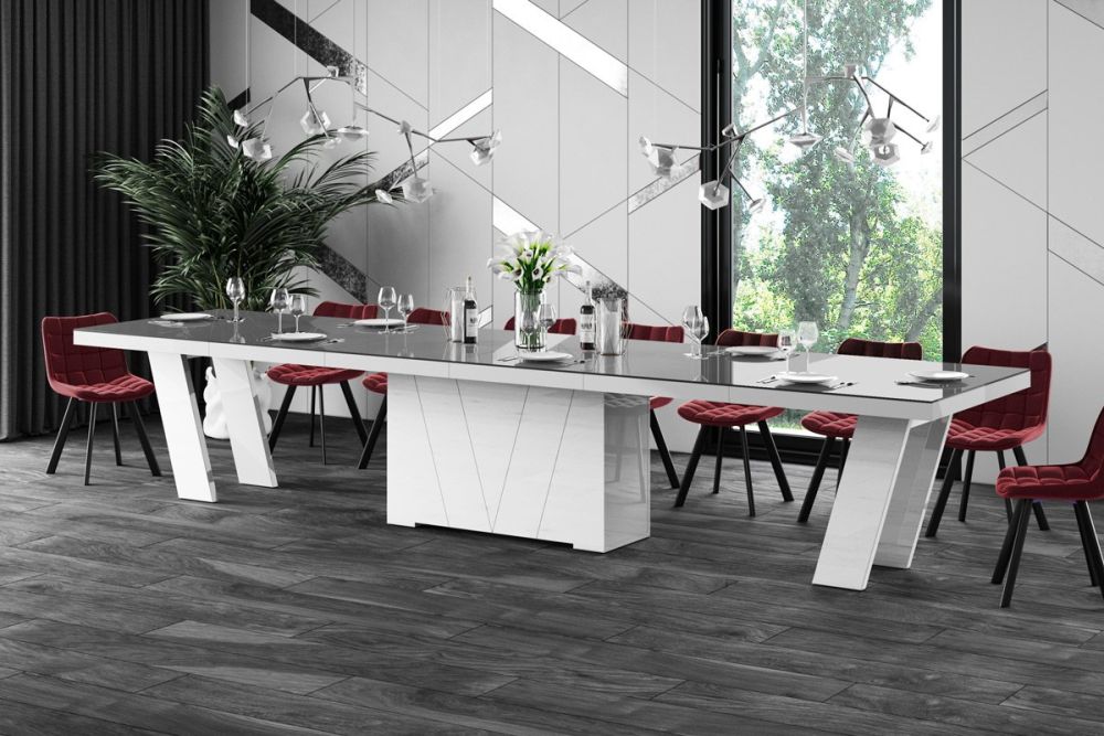 Modernų ištraukiamą stalą GRANDE pagamino Lenkijos gamintojas iš aukštos kokybės MDF plokštės, padengtos blizgiu akriliniu kilimėliu. Ši medžiaga pasižymi padidintu atsparumu įbrėžimams ir UV spinduliams, todėl ji neišbluks net veikiama saulės spindulių. Dėl didelio stalviršio atsparumo karščiui (iki 100 °C) ant jo galima be jokių problemų dėti karštus patiekalus. Šis pilkai baltas valgomojo ir svetainės stalas puikiai atrodys tiek moderniame, tiek prabangiame interjere.