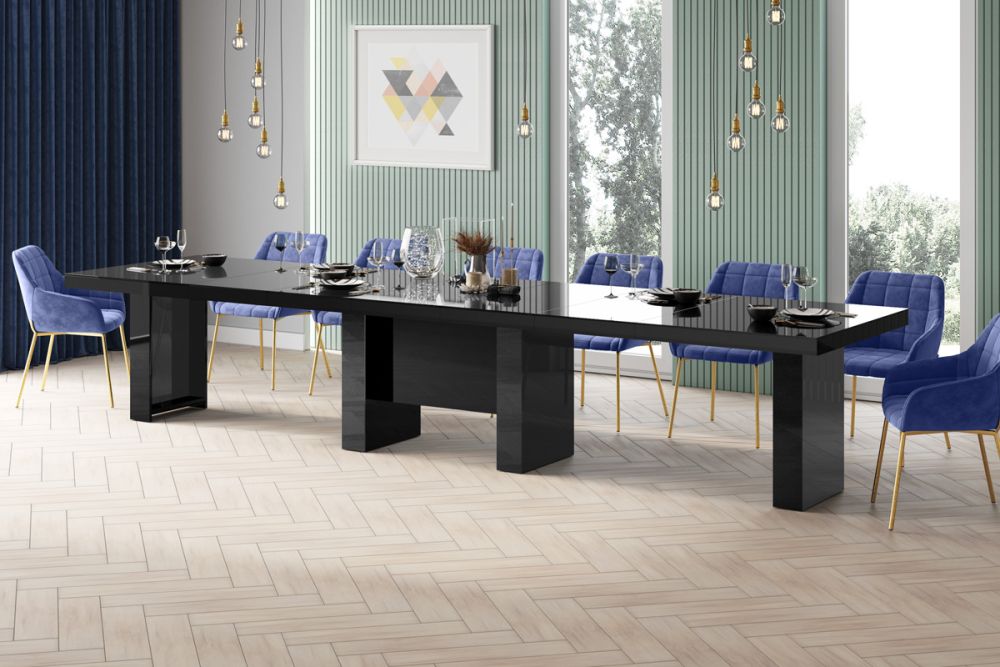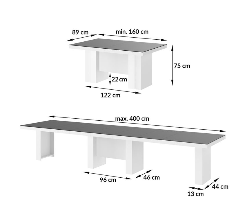 Išskleidžiamas stalas LARGO yra puikus lenkų inovacijų pavyzdys, sukurtas garsios „Hubertus“ kompanijos. Šis išskirtinis stalas buvo sukurtas taip, kad patenkintų net ir reikliausius lūkesčius. Šio gaminio unikalumas slypi tobulame funkcionalumo ir estetikos derinyje. Stalas pagamintas iš aukštos kokybės MDF plokštės, padengtos specialiu akriliniu kilimėliu su veidrodiniu paviršiumi. Tai suteikia jam ne tik elegantišką išvaizdą, bet ir užtikrina patvarumą bei atsparumą įvairiems veiksniams. Blizgus paviršius ne tik gražiai atspindi šviesą, bet ir yra atsparus įbrėžimams, UV spinduliams ir aukštai temperatūrai, todėl stalas daugelį metų išliks puikios būklės. Vienas iš neginčijamų LARGO išskleidžiamo stalo privalumų yra įspūdingas dydis. Jis pasiekia maksimalų 4 metrų ilgį, todėl tai yra vienas didžiausių rinkoje esančių modelių. Visiškai išskleistas, prie jo patogiai telpa iki 20 žmonių, todėl tai puiki erdvė šeimos susibūrimams ar vakarėliams. Sulankstytas, prie jo vis tiek patogiai telpa 8 žmonės, todėl tai neįtikėtinai universalus baldas. Norėdami pritaikyti stalą pagal savo individualius poreikius, komplekte yra penki prailginimai, kurie patogiai laikomi specialiai tam skirtoje kolonoje, esančioje stalo pagrinde. Šis novatoriškas sprendimas stalviršio prailginimą paverčia neįtikėtinai paprastu ir intuityviu. Dėl pažangių sinchroninių rutulinių guolių kreipiančiųjų stalo prailginimas tampa neįtikėtinai sklandus ir ergonomiškas. Tiesiog švelniai patraukite stalviršį iš vienos pusės, ir jis tuo pačiu metu be vargo išsiplės iš kitos pusės. Pabrėžiant šio sprendimo modernumą, stalą galima laisvai išplėsti papildomais prailginimais, todėl galite pritaikyti jo dydį prie savo esamų poreikių. Tai puikus būdas optimizuoti erdvės panaudojimą, nepriklausomai nuo aplinkybių. Be jokios abejonės, šis modernus stalas ne tik papildys bet kokį interjerą, bet ir taps unikaliu, funkcionaliu jo akcentu. Produkto savybės