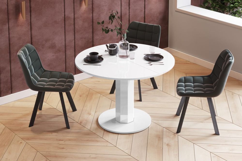 Ištraukiamas stalas SOLO – unikalus lenkiškas gaminys, sukurtas galvojant apie modernų interjerą. Minimalistinis dizainas ir madingos spalvos puikiai tinka bet kokiam dekorui, nepaisant dabartinių tendencijų. Pagamintas iš aukštos kokybės MDF plokštės, padengtos akriliniu kilimėliu, suteikiančiu jam elegantišką blizgesį, primenantį žvilgantį veidrodį, stalas išsiskiria ne tik savo stiliumi, bet ir patvarumu. Pagrindinis šios medžiagos privalumas – padidėjęs atsparumas įbrėžimams, UV spinduliams ir aukštai temperatūrai iki 100 °C, todėl jis yra itin patvarus ir lengvai prižiūrimas. Gamintojas rekomenduoja švelniai valyti stalą šiek tiek drėgna mikropluošto šluoste, nenaudojant ploviklių, kad ilgiau išlaikytų nepriekaištingą išvaizdą. Vienakojas stalas ne tik garantuoja stabilumą, bet, svarbiausia, suteikia patogų sėdėjimą. Jo konstrukcija leidžia patogiai naudotis, nerizikuojant susitrenkti kojų. Stalas turi sinchroninius rutulinius guolius, todėl jį nepaprastai lengva ir be vargo ištraukti. Tiesiog patraukite stalviršį iš vienos pusės, ir kita tuo pačiu metu ištrauks. Ištraukiamas stalas tiekiamas su vienu prailginimo įdėklu, kuris laikomas po stalviršiu. Apvalus SOLO ištraukiamo stalo stalviršis taip pat patogiai talpina daugiau žmonių nei tradiciniai keturkojai stalai, todėl tai puikus pasirinkimas šeimos susibūrimams ar vakarėliams su draugais.