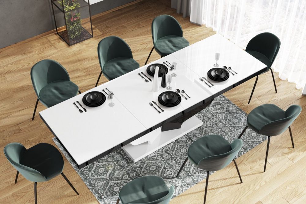 Lenkų gamintojo HUBERTUS VIVA stalą sukūrė moderniam interjerui, kuriame idealiai tinka blizgūs baldai. Šis stalas pasižymi neįprastu pagrindu, kurio formą gamintojas apibūdina kaip “drugelio sparnus”. Šis dizainerio stalas pagamintas iš aukštos kokybės MDF plokštės su matiniu akrilo paviršiumi, suteikiančiu jam blizgų, veidrodinį pavidalą. Ištraukiamas VIVA stalas turi du stalviršio prailginimus, todėl stalą galima lengvai prailginti iki 208 arba 256 cm. Prailginimai laikomi po stalviršiu, todėl nereikia ieškoti atskiros saugyklos. Stalas lengvai ištraukiamas dėl sinchroninių rutulinių guolių bėgelių. Tiesiog švelniai patraukite stalviršį iš vienos pusės, ir kita ištrauksis vienu metu. Produkto savybės