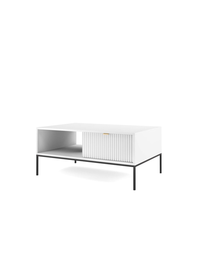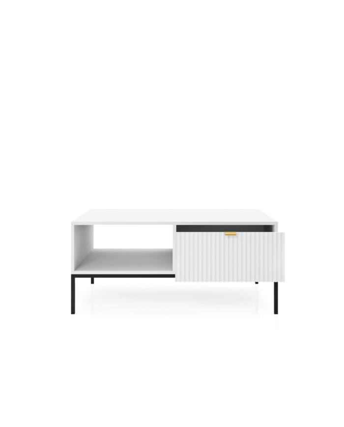 Dizainerio „Nova L104“ kavos staliukas pagamintas iš laminuotos baldų plokštės, kuri pasižymi padidintu atsparumu įbrėžimams ir karščiui iki 100 °C. Apatinėje dalyje yra aukštos (20 cm) juodos metalinės kojelės, sujungtos su tvirtu rėmu. Stalo korpusas padengtas baltu laminatu, o stalčiaus priekis – baltu, grioveliuotu MDF. Stalas priklauso platesnei to paties pavadinimo baldų kolekcijai. Jį reikia surinkti, pridedamos aiškios instrukcijos. Stalas taip pat gali būti su auksiniu pagrindu ir kojelėmis.