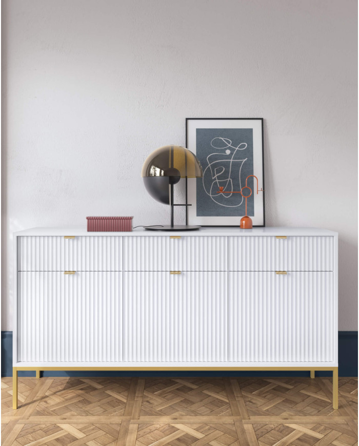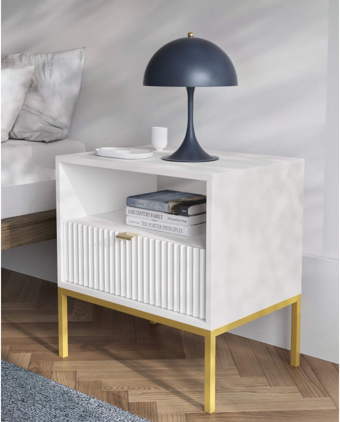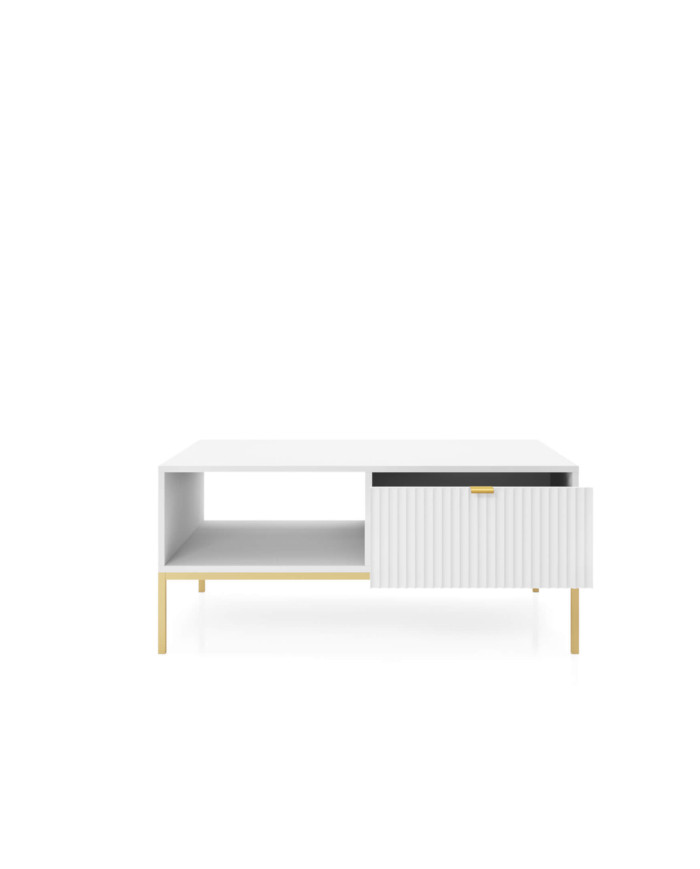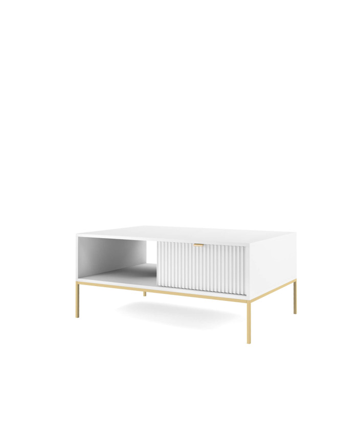 Patrauklus ir modernus kavos staliukas „Nova L104“ pagamintas iš laminuotos baldų plokštės, kuri pasižymi padidintu atsparumu įbrėžimams ir karščiui iki 100 laipsnių Celsijaus. Apatinėje dalyje yra aukštos (20 cm) auksinės metalinės kojelės, sujungtos su tvirtu rėmu. Komplekto korpusas padengtas baltu laminatu, o stalčiaus priekis – baltu, grioveliuotu MDF. Staliukas priklauso platesnei to paties pavadinimo baldų programai. Surinkimas yra būtinas, pridedamos aiškios instrukcijos. Šis baldas buvo sukurtas galvojant apie šiuolaikišką, modernų interjerą. „Nova“ kavos staliukas taip pat gali būti su juodu pagrindu ir kojelėmis.