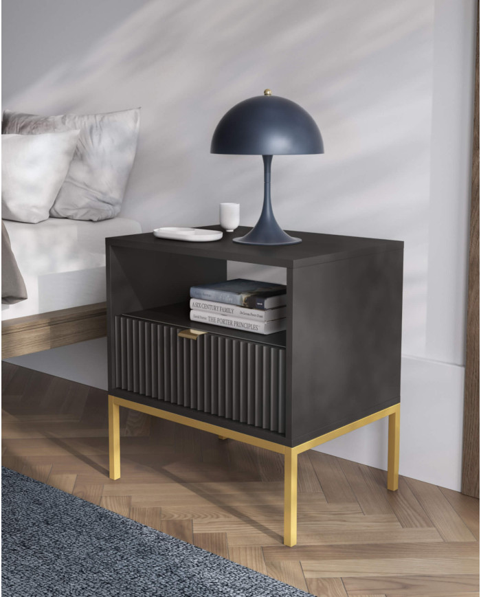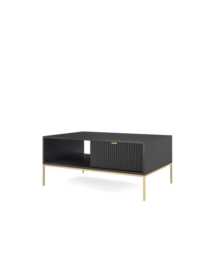 Patrauklus ir modernus kavos staliukas „Nova L104“ pagamintas iš juodos laminuotos baldų plokštės, kuriai būdingas padidintas atsparumas įbrėžimams ir karščiui iki 100 laipsnių Celsijaus. Apatinėje dalyje yra aukštos (20 cm) auksinės metalinės kojelės, sujungtos su tvirtu ir stabiliu rėmu. Grioveliais išraižytų stalčių priekinę dalį puošia graži auksinė rankena. Staliukas turi būti surinktas, pridedamos aiškios instrukcijos. Šis kavos staliukas buvo sukurtas atsižvelgiant į šiuolaikišką, modernų interjerą ir taip pat galima įsigyti su juodu pagrindu.