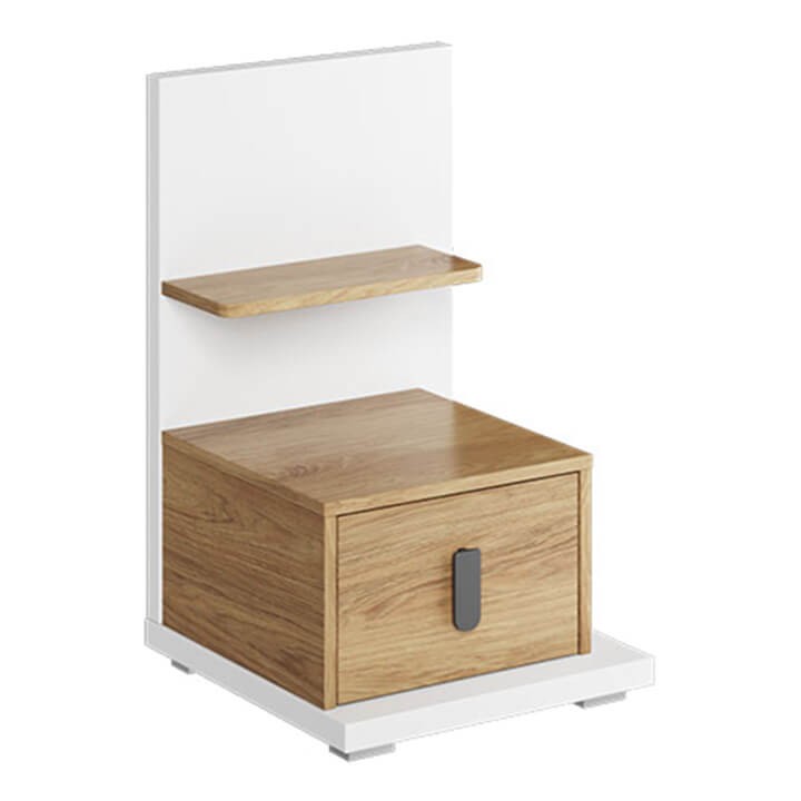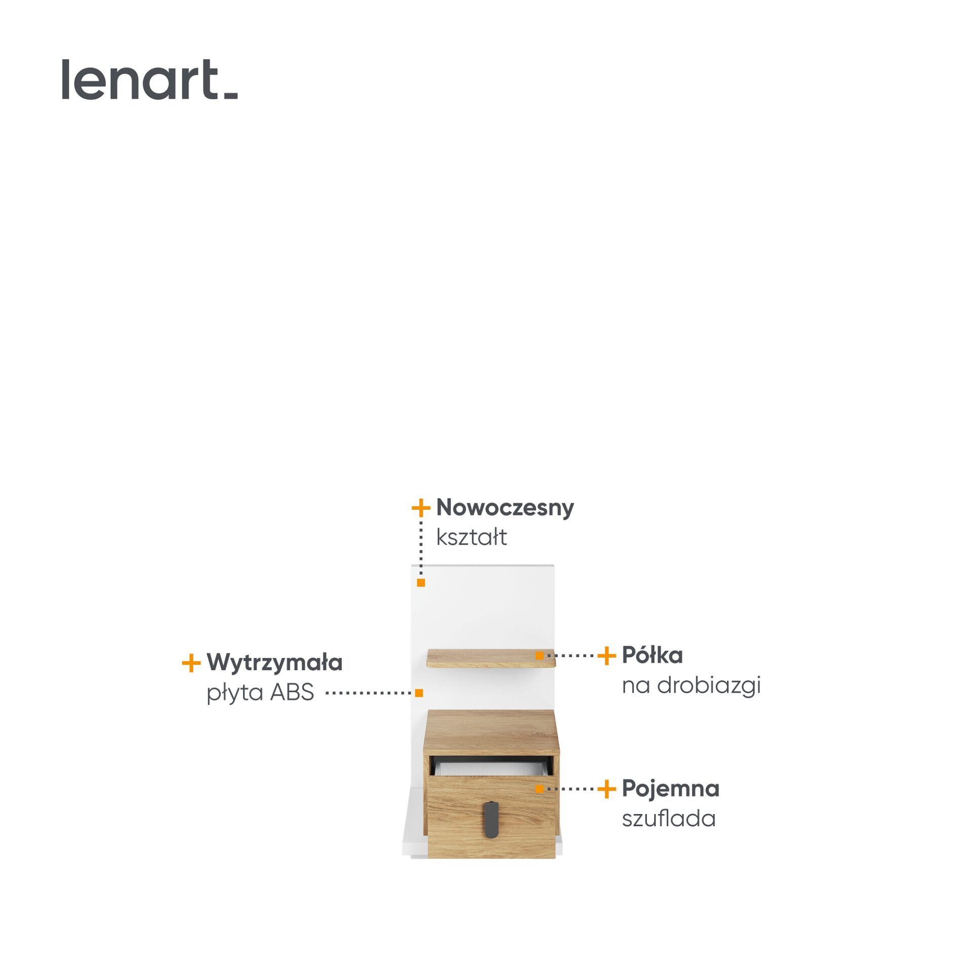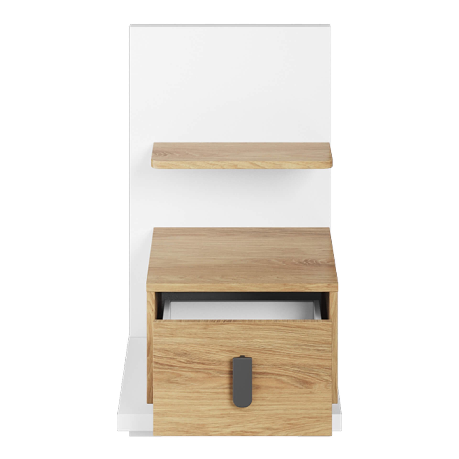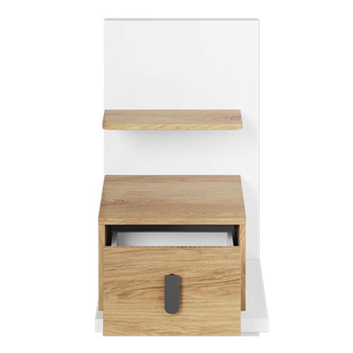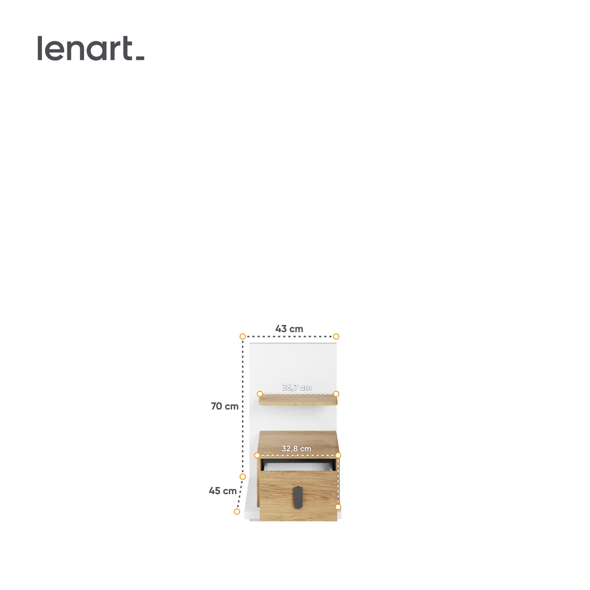 Modelis: MS-08 Spalva: balta / natūrali hikorija Matmenys: Plotis: 43 cm Aukštis: 70 cm Gylis: 45 cm Pagrindinė informacija: … S 1,70 mm korpuso spalva: balta / natūrali hikorija viršus: laminuota medžio drožlių plokštė; 16 mm viršutinės briaunos apdaila: B 1,0 mm klijuotų viršutinių briaunų skaičius: 3 viršutinė spalva: natūrali hikorija galinė sienelė: laminuota medžio drožlių plokštė; 32 mm matomos galinės sienelės dalies apdaila: laminatas nematomos galinės sienelės dalies apdaila: neapdorota galinės sienelės spalva: balta lentyna: laminuota medžio drožlių plokštė; 32 mm lentynos krašto apdaila: S 1,7 mm klijuotų lentynos kraštų skaičius: 3 leistina lentynos apkrova: 5 kg lentynos spalva: natūrali hikorija lentynų skaičius: 1 priekis: laminuota medžio drožlių plokštė; 16 mm priekinės briaunos apdaila: B 1,0 mm priekinė spalva: natūrali hikorija stalčiaus vidinė apdaila: balta juostelė stalčiaus apačia: HDF plokštė; 3 mm Svarbu: Stalas gaminamas pagal individualų kliento užsakymą. Užsakymo atšaukti negalima praėjus 48 valandoms nuo pateikimo. Prašome apsipirkti atsargiai.