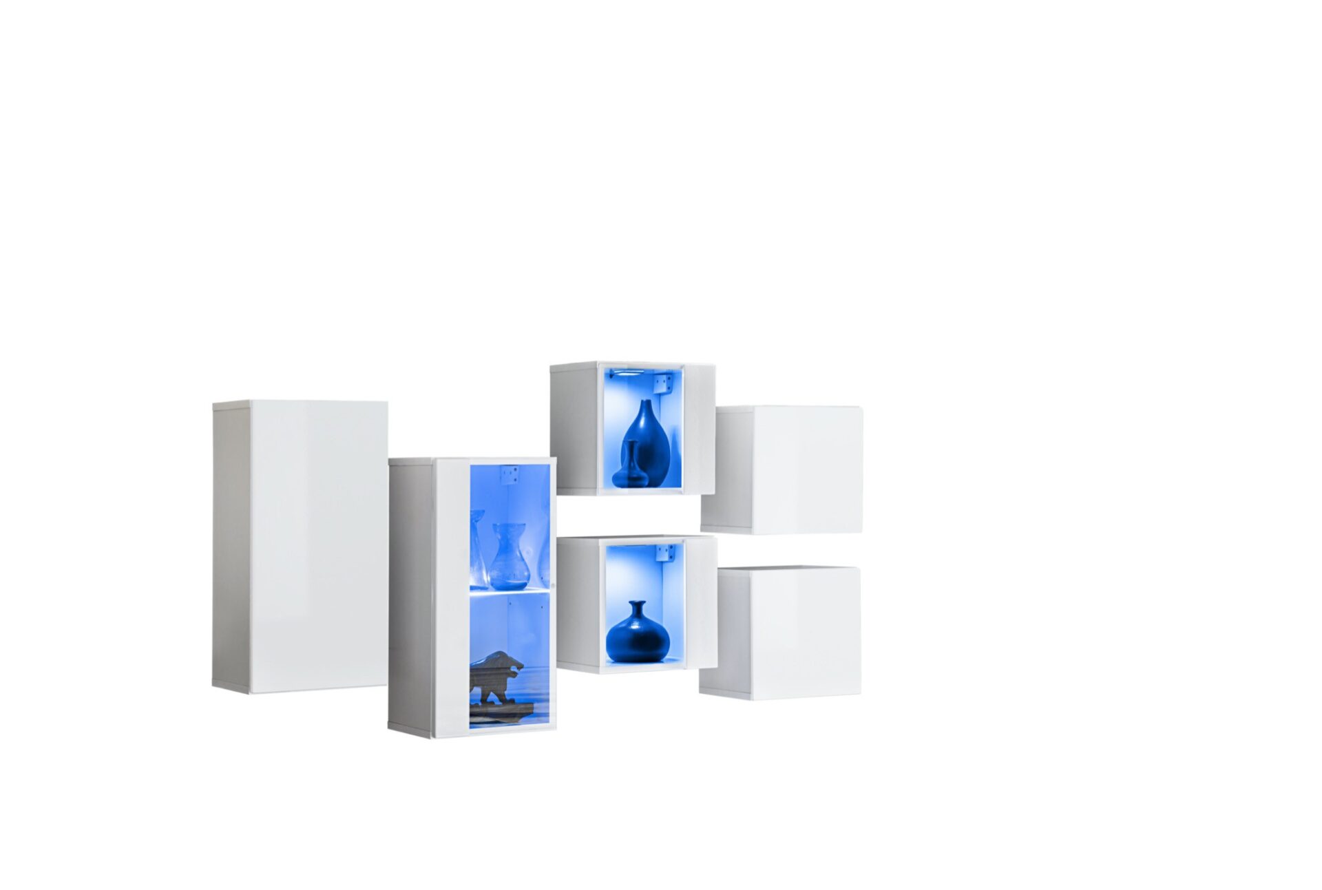 Pakabinama spintelė: durelės, už kurių yra viena standartinė lentyna (2 vietos). Pakabinama vitrina: iš dalies įstiklintos durelės, už kurių yra skyrius su stikline lentyna, apšviesta mėlynu LED apšvietimu. 2x Pakabinamos vitrinos: iš dalies įstiklintos durelės, už kurių yra skyrius, apšviestas mėlynu LED apšvietimu. 2x Pakabinama spintelė: durelės, už kurių yra vienas skyrius. Priekinės dalys atsidaro spustelėjimo mechanizmu.