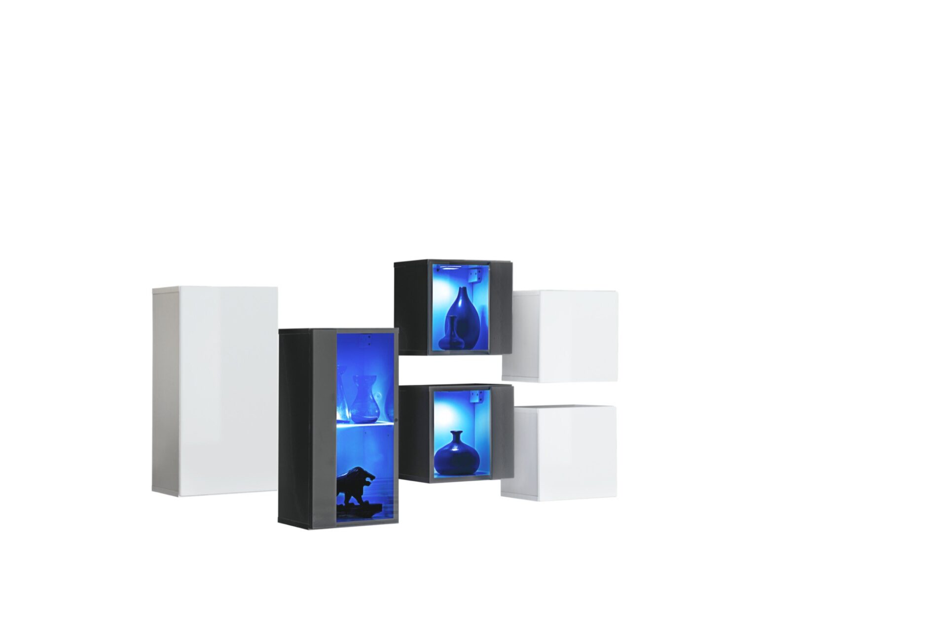 Pakabinama spintelė: durelės, už kurių yra viena standartinė lentyna (2 vietos). Pakabinama vitrina: iš dalies įstiklintos durelės, už kurių yra skyrius su stikline lentyna, apšviesta mėlynu LED apšvietimu. 2x Pakabinamos vitrinos: iš dalies įstiklintos durelės, už kurių yra skyrius, apšviestas mėlynu LED apšvietimu. 2x Pakabinama spintelė: durelės, už kurių yra vienas skyrius. Priekinės dalys atsidaro spustelėjimo mechanizmu.