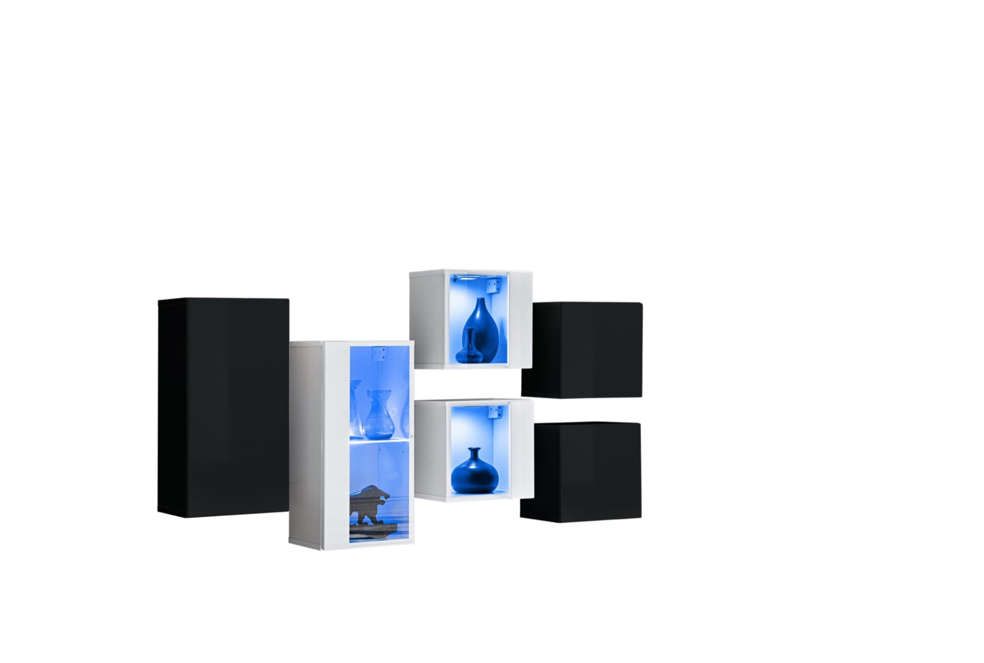 Pakabinama spintelė: durelės, už kurių yra viena standartinė lentyna (2 vietos). Pakabinama vitrina: iš dalies įstiklintos durelės, už kurių yra skyrius su stikline lentyna, apšviesta mėlynu LED apšvietimu. 2x Pakabinamos vitrinos: iš dalies įstiklintos durelės, už kurių yra skyrius, apšviestas mėlynu LED apšvietimu. 2x Pakabinama spintelė: durelės, už kurių yra vienas skyrius. Priekinės dalys atsidaro spustelėjimo mechanizmu.