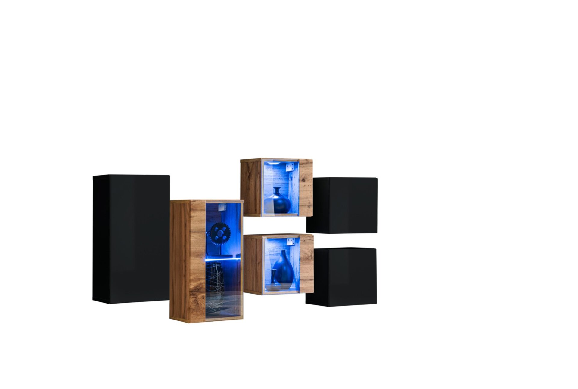 Pakabinama spintelė: durelės, už kurių yra viena standartinė lentyna (2 vietos). Pakabinama vitrina: iš dalies įstiklintos durelės, už kurių yra skyrius su stikline lentyna, apšviesta mėlynu LED apšvietimu. 2x Pakabinamos vitrinos: iš dalies įstiklintos durelės, už kurių yra skyrius, apšviestas mėlynu LED apšvietimu. 2x Pakabinama spintelė: durelės, už kurių yra vienas skyrius. Priekinės dalys atsidaro spustelėjimo mechanizmu.