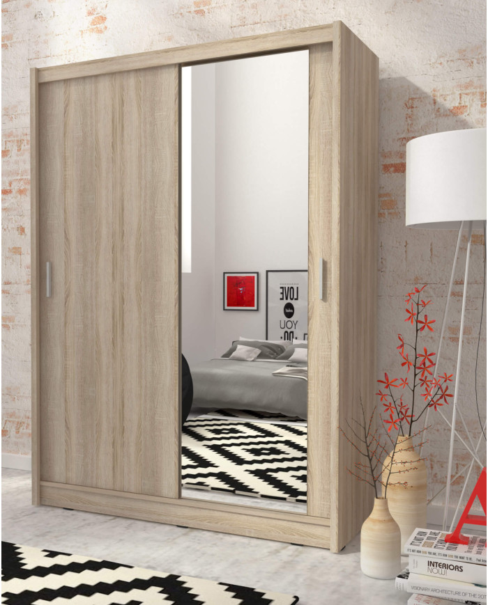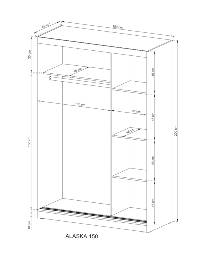 Dėl vidutinio dydžio „Alaska 150“ spinta suteikia daug vietos daiktams ir didelėms dėžėms susidėti. Spintoje yra dvejos stumdomos durys, vienos iš jų – su dideliu veidrodžiu. Komplekto viduje yra didelės ir mažos lentynos drabužiams, dėžėms ir smulkiems daiktams, taip pat pakaba ilgiems ir trumpiems drabužiams. Spinta apdailinta Sonoma ąžuolu ir pagaminta iš patvarios laminuotos baldų plokštės, kuri yra atsparesnė įbrėžimams. Komplektas pristatomas supakuotas, kartu su lengvai suprantamomis surinkimo instrukcijomis ir furnitūra.