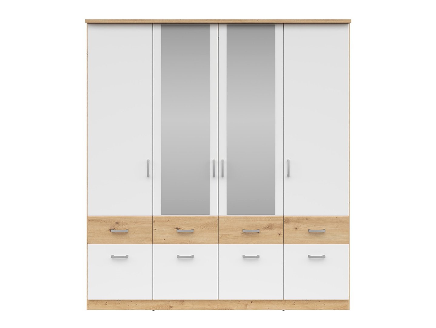 Keturių durų spinta su šešiais stalčiais ir veidrodžiu BRANDO 4, ąžuolo/tekstilės/baltos spalvos