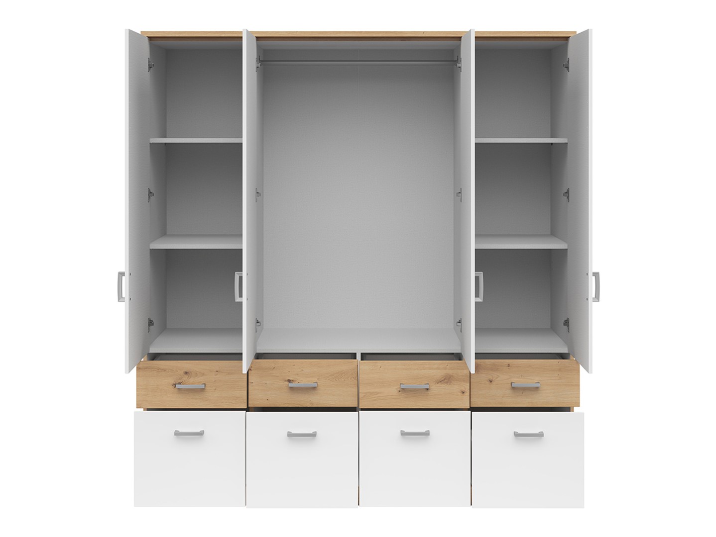 „Brando 4“ spinta – erdvės organizavimo revoliucija. Ar svajojote apie baldą, kuris ne tik puikiai atrodytų jūsų namuose, bet ir padėtų palaikyti tvarką? „Brando 4“ spinta – tai atsakymas į jūsų poreikius, siūlanti išskirtinę estetiką ir praktiškus sprendimus. Pirmiausia akį patraukia erdvios lentynos už išorinių durelių. Jos puikiai tinka laikyti drabužius, rankšluosčius, batus, knygas ir dokumentus. Jos padeda išlaikyti tvarką ir lengvai pasiekti būtiniausius daiktus. „Brando 4“ spinta yra svarbus kasdienės tvarkos elementas. Vidurinės durys slepia erdvę su pakabinimo skersiniu, skirtu subtiliems audiniams. Šioje dalyje pakabinkite drabužius, kad išvengtumėte raukšlių ir liktų laiko malonesnei veiklai. Dabar jūsų spinta taps vieta, kur tvarka dera su elegancija. Nereikėtų pamiršti ir aštuonių praktiškų stalčių apatinėje spintos dalyje. Keturi seklesni stalčiai puikiai tinka laikyti apatinius drabužius, kojines ar smulkius aksesuarus, kuriuos norite visada turėti po ranka. Keturiuose gilesniuose stalčiuose tilps patalynė ar antklodės, todėl jūsų miegamasis visada atrodys tvarkingai. Estetiškas „Brando 4“ spintos dizainas pasižymi madingo ąžuolo atspalvio ir elegantiškos matinės baltos spalvos deriniu. Centrines durų priekines dalis puošia praktiškas veidrodis, palengvinantis kasdienius ruošimus. Sidabrinės rankenėlės puikiai papildo bendrą dizainą, suteikdamos baldui modernumo. Trumpai tariant, „Brando 4“ spinta yra daugiau nei tik daiktadėžė; tai tikra erdvės organizavimo revoliucija. Paprastas, modernus dizainas dera su funkcionalumu, suteikiančiu kambariui unikalaus žavesio ir elegancijos. Tai ne tik baldas, tai gyvenimo būdas!
