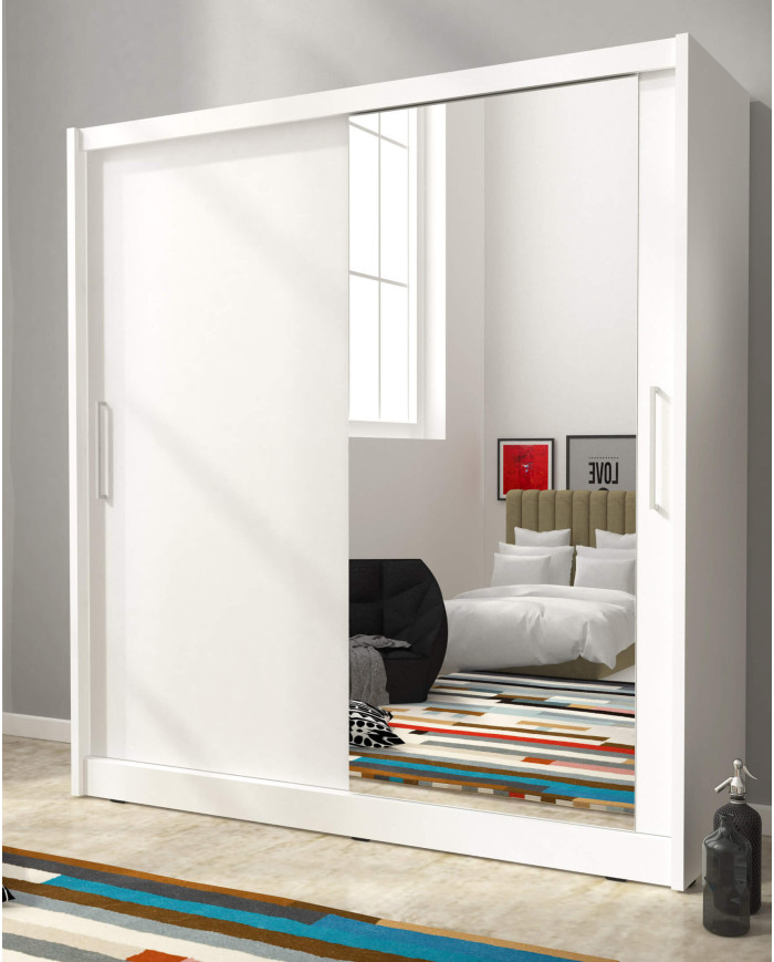 Maja 1 spinta, dvidurė, 180 cm, stumdomos, lentynos, pakaba, veidrodis, balta